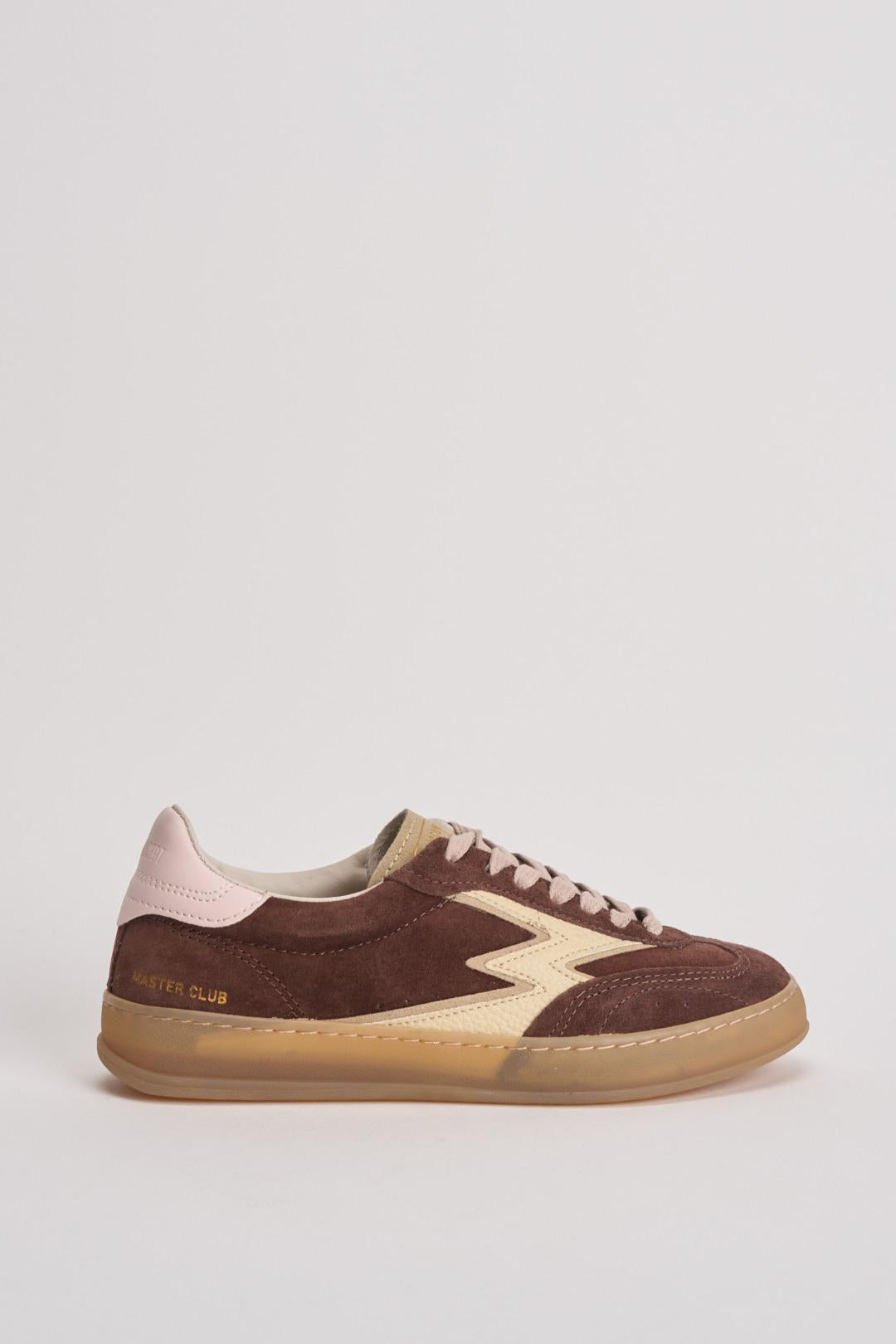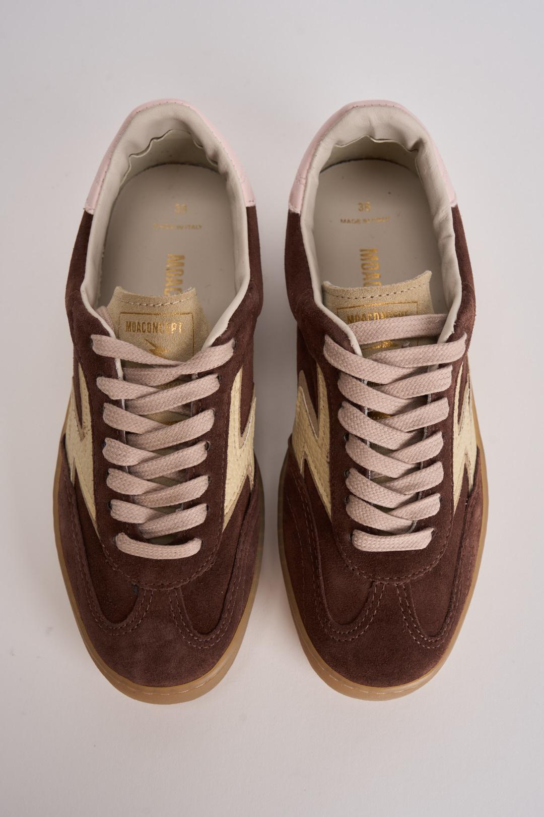 MOA Sneakers donna marrone e rosa. Modello con linguetta in suede verde, talloncino in pelle rosa e logo in pelle bianco laterale. Suola alta 3,4 cm, lacci in cotone bianco. Calzata regolare.