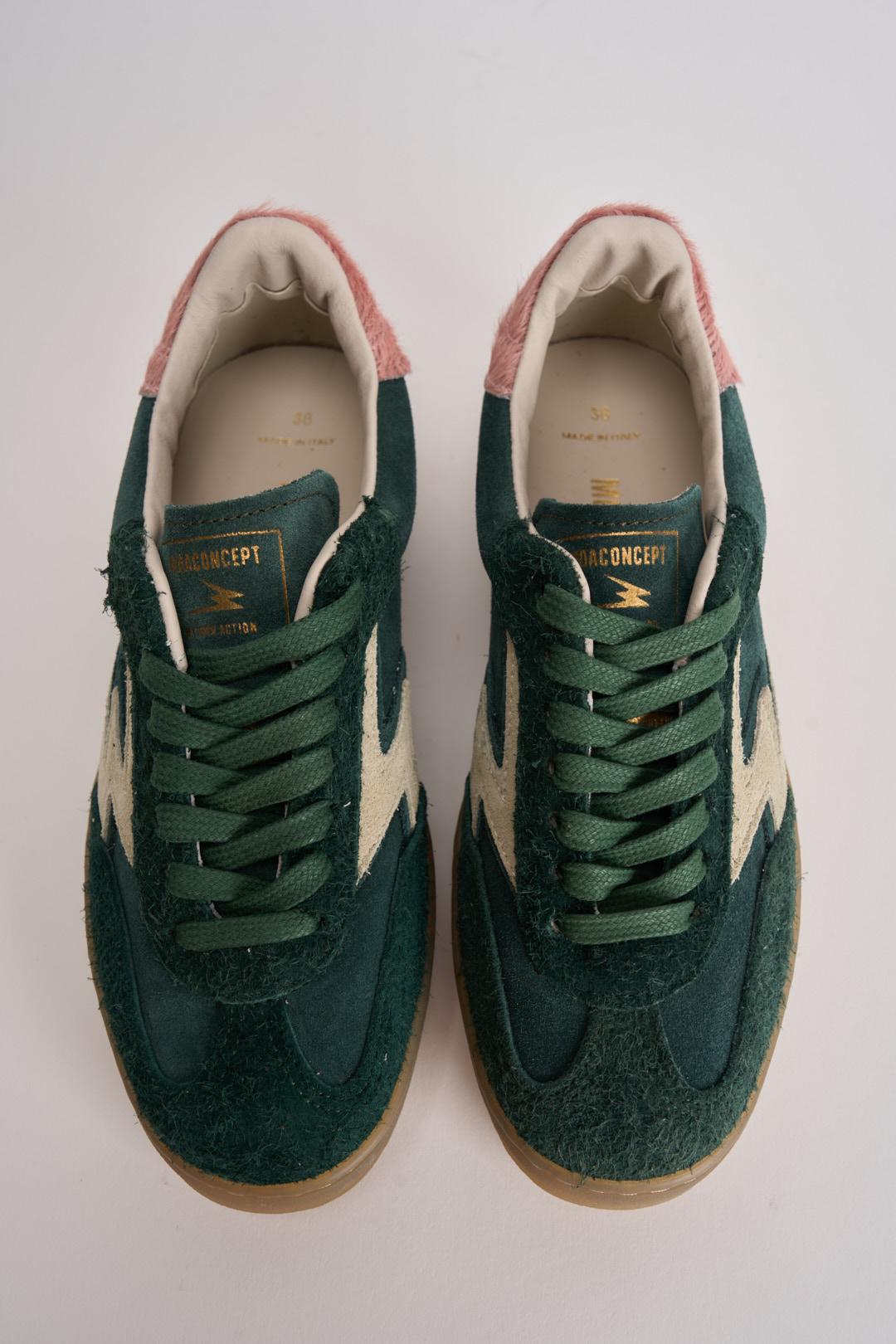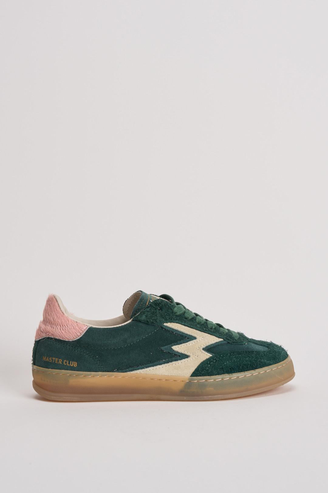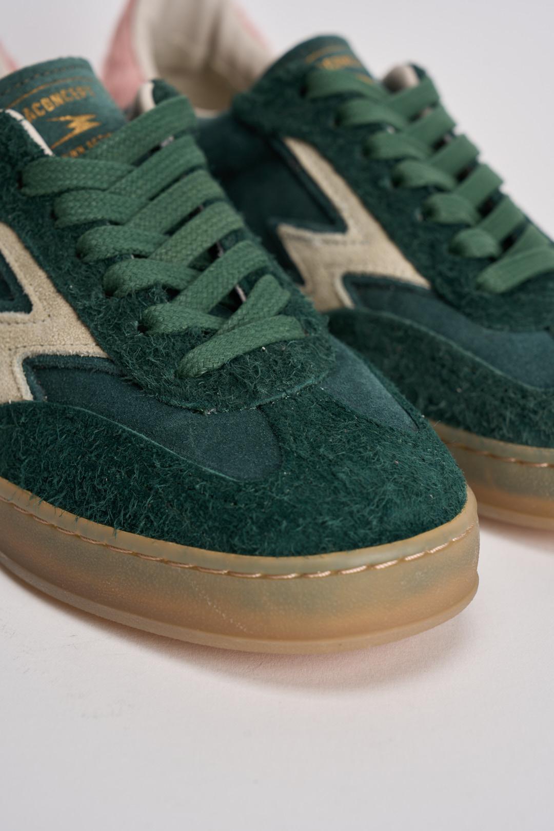 MOA Sneakers donna verde e rosa. Modello con linguetta in suede verde, talloncino in pelle rosa e logo in pelle bianco laterale. Suola alta 3,4 cm, lacci in cotone bianco. Calzata regolare.
