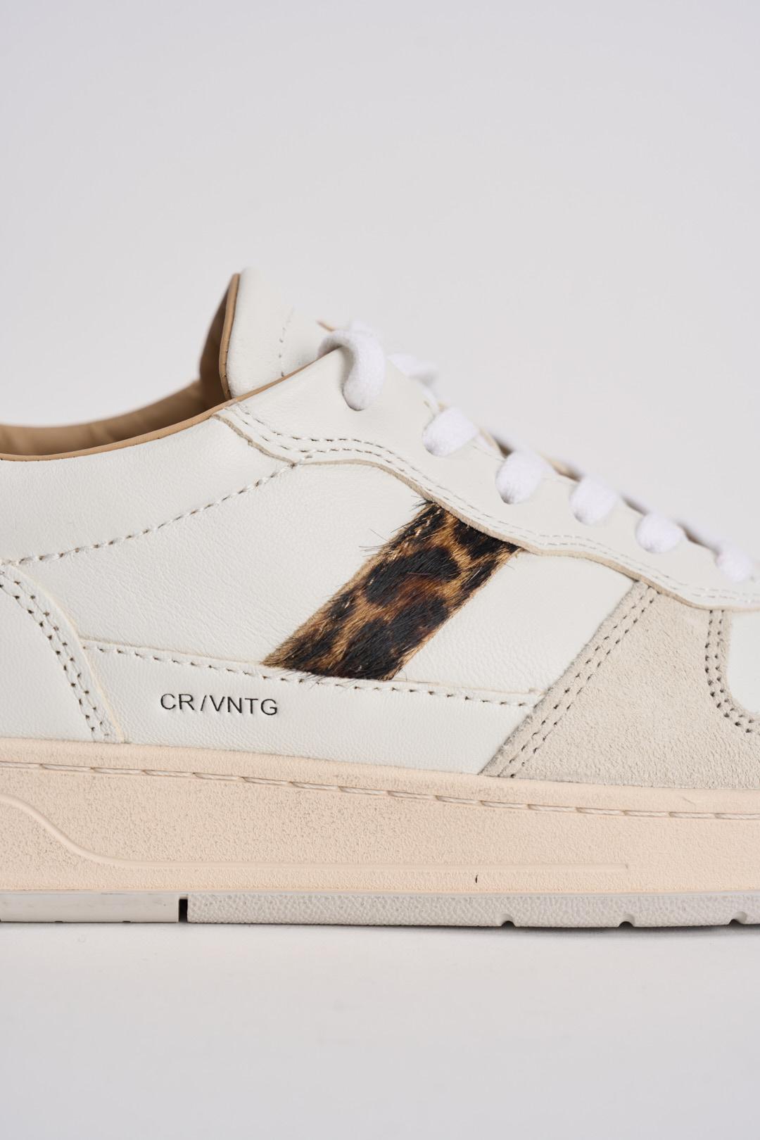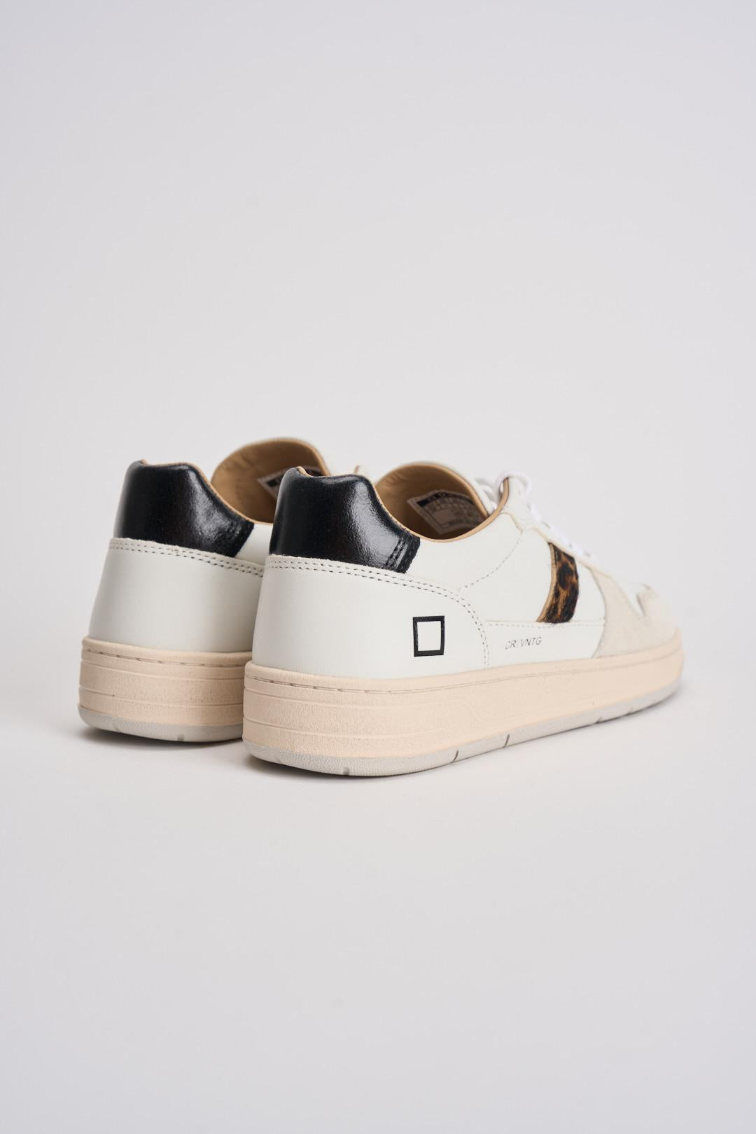 D.A.T.E Sneakers donna W431-C2-VC-WD Court 2.0 vintage bianca e lepardata. Modello con punta traforata per una maggiore traspirabilità. Sulla linguetta è impressa la scritta D.A.T.E. Allacciatura classica e lacci in cotone. Il codice e il logo quadrato sono impressi lateralmente. Tomaia in pelle bianca e dettaglio in cavallino animalier.Tallone in pelle nero. Plantare interno estraibile. Fondo vintage in gomma. Soletta in pelle. Calzata regolare.