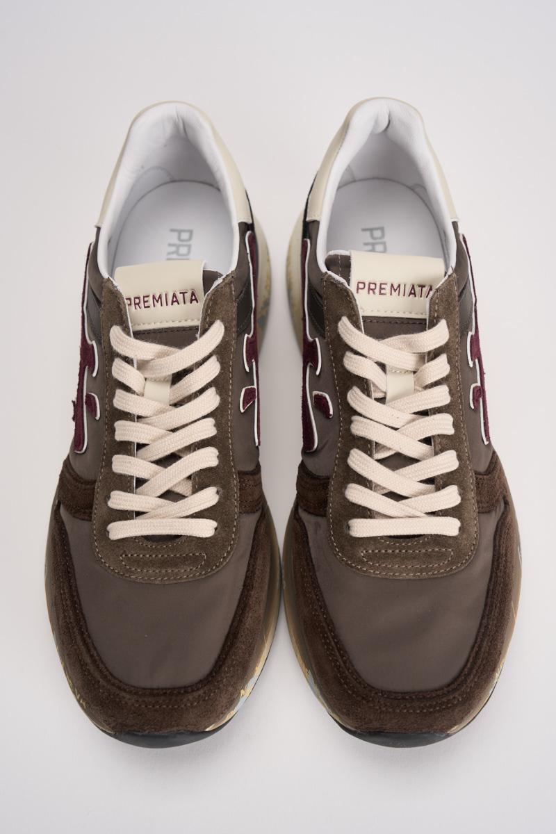 PREMIATA Sneakers Mick uomo marroni fango. Prodotte con materiali italiani di ottima fattura, sono realizzate in suede con inserti in pelle. Caratteristica principale l'insolita intersuola stampata dal twist unico con plateau per slanciare la silhouette. Completa il design esclusivo l'iconico logo laterale. Composizione: 80% eva, 20% gomma 15% pelle. Fodera: 86% pelle 14% pu. Altezza suola 4,2 cm.