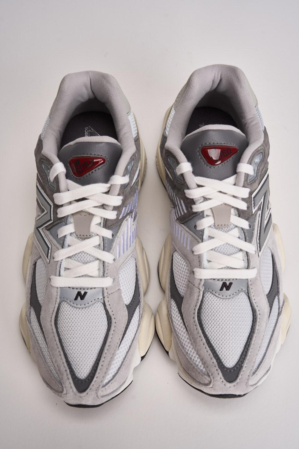 NEW BALANCE Sneakers uomo 9060 bianche e grigie. Tomaia in mesh con finiture in pelle scamosciata. Intersuola a doppia densità con ammortizzazione ABZORB e SBS. Dispositivo CR traslucido. Suola con motivo a rombi ispirato al design classico del modello 860. Calzata regolare.
