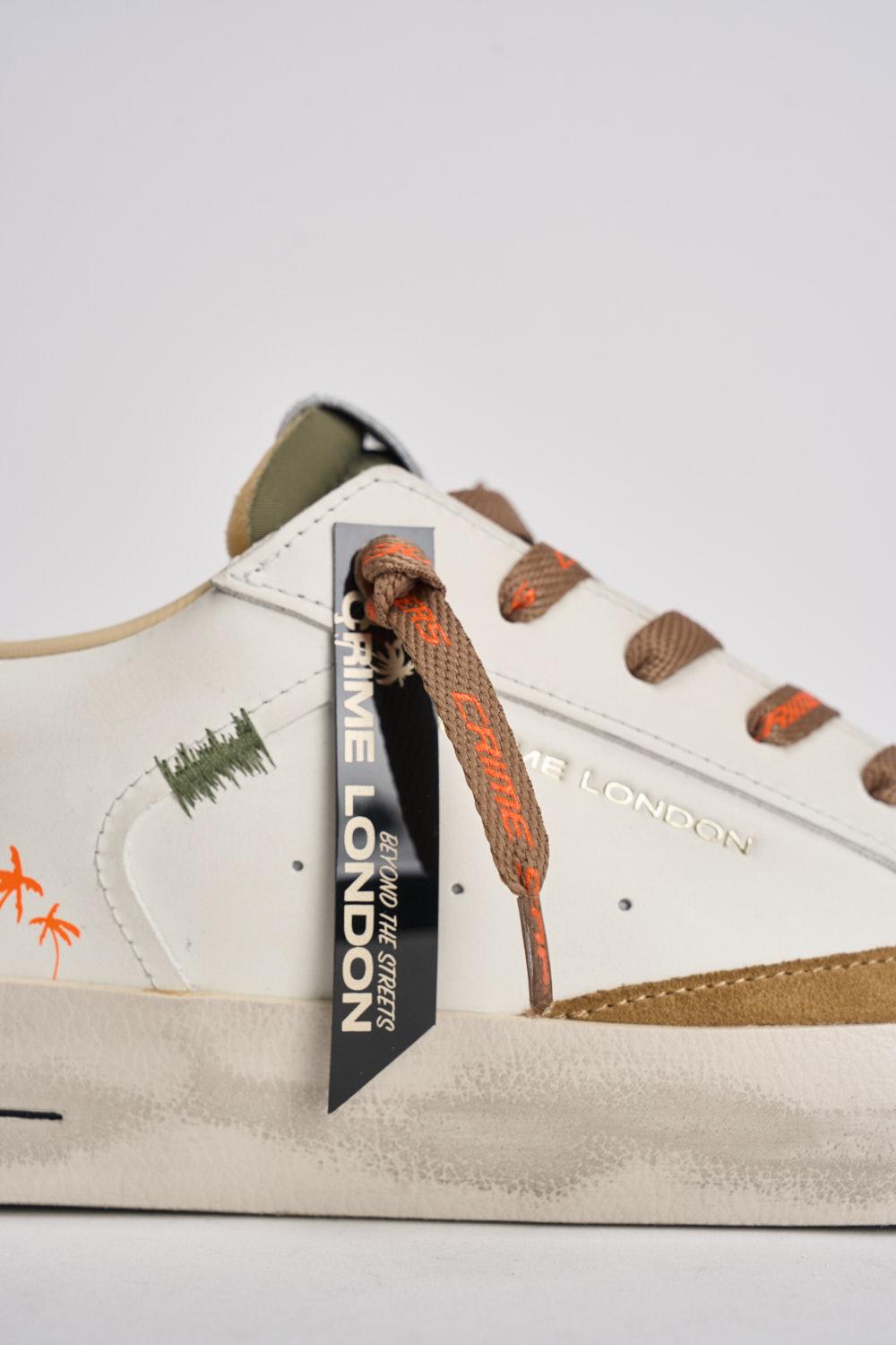 CRIME LONDON Sneakers uomo bianche e arancioni. Modello in pelle bianca con dettaglio talloncino arancione e dettagli in suede cammello e verdi. Patch in pelle nera sul retro e tag specchiato oro. Linguetta in pelle verde. Chiusura con lacci neri. Calzata regolare.