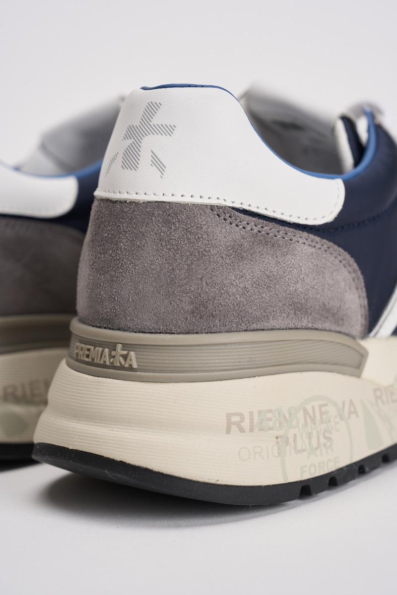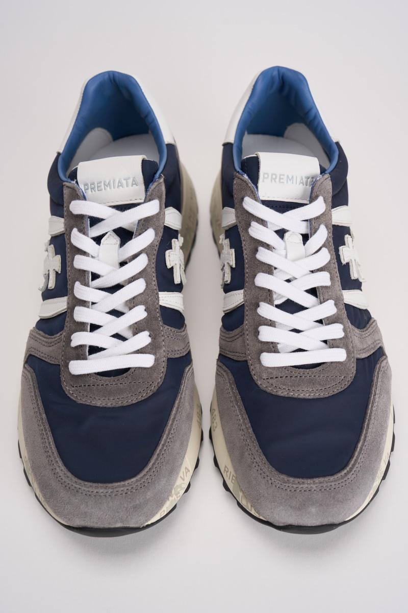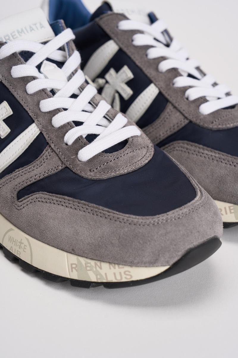 PREMIATA Sneakers uomo Lander 7203 blu. Pelle scamosciata e nylon. Dettagli in pelle bianca e grigia. Logo laterale bianco cucito in pelle. Suola oversize sfumata con stampa lettering. Altezza suola 4,2 cm. Composizione: 100% Pelle.
