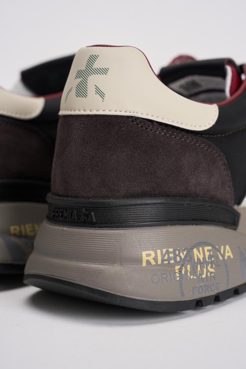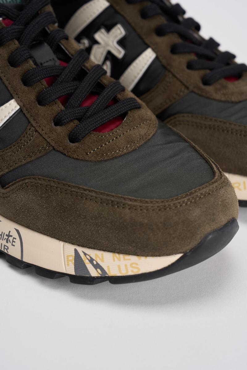 PREMIATA Sneakers uomo Lander 7203 verde. Pelle scamosciata e nylon. Dettagli in pelle bianca e grigia. Logo laterale bianco cucito in pelle. Suola oversize sfumata con stampa lettering. Altezza suola 4,2 cm. Composizione: 100% Pelle. Calzata regolare.