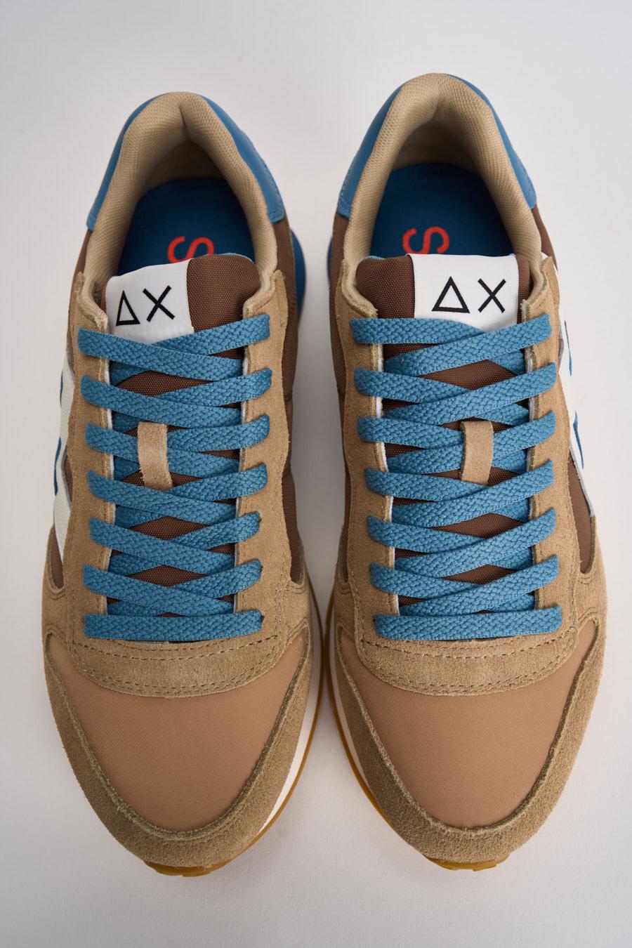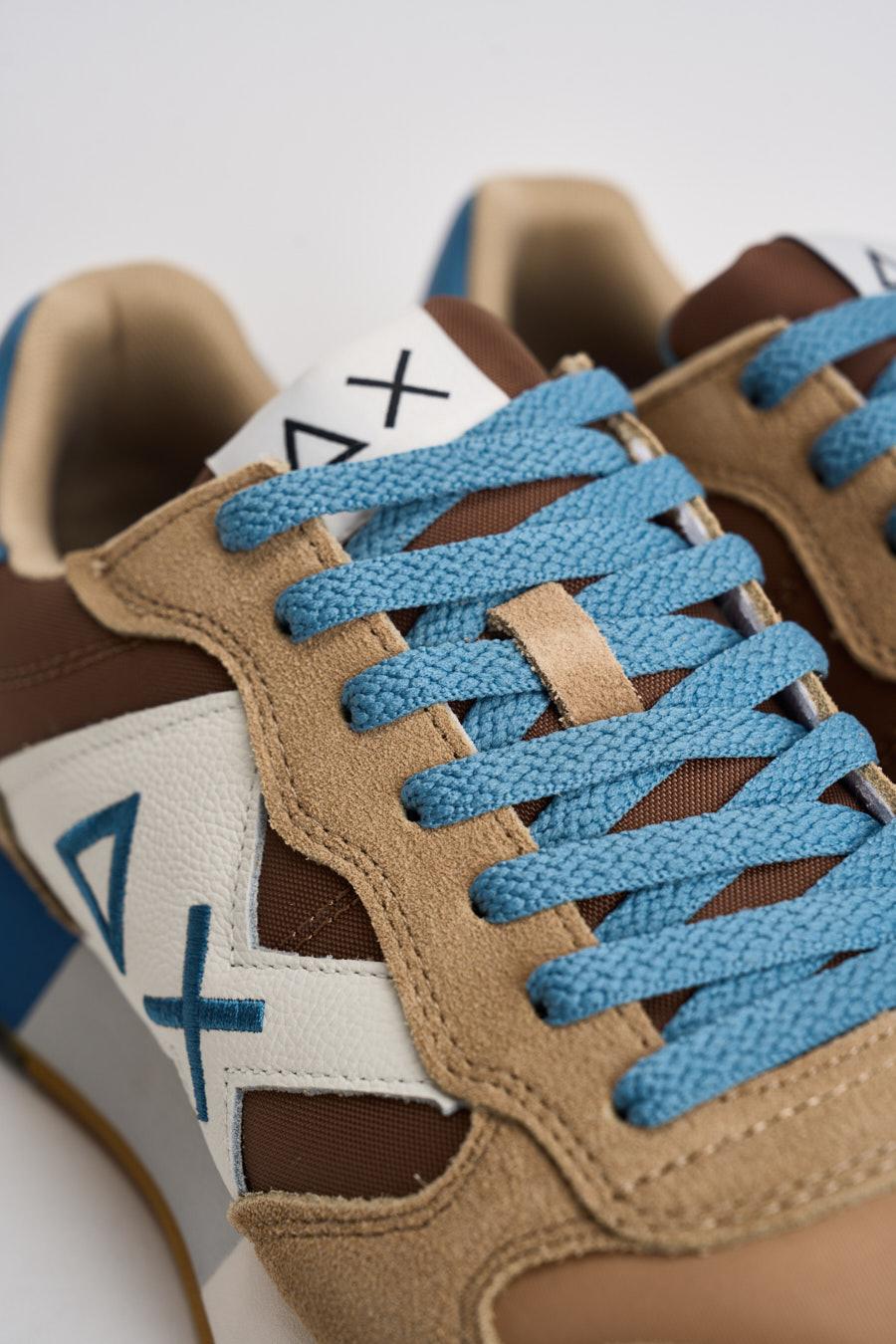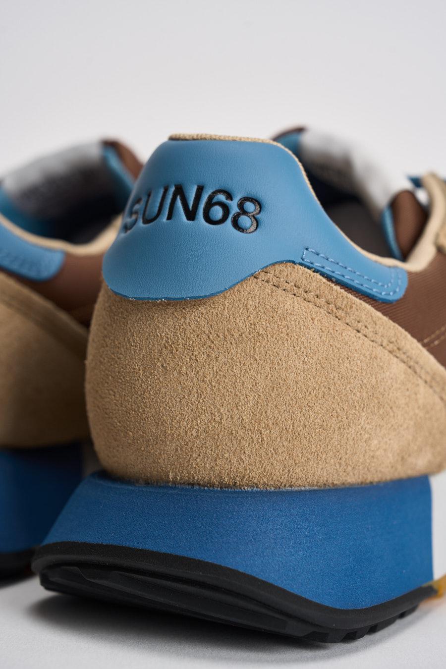 SUN68 Sneakers uomo multicolor celeste. Modello con tomaia in camoscio e tessuto cammello, beige e bianco. Talloncino sul retro in pelle celeste e logo cucito in blu. Plantare estraibile, suola in gomma multicolor. Composizione: pelle e tessuto. Calzata precisa.