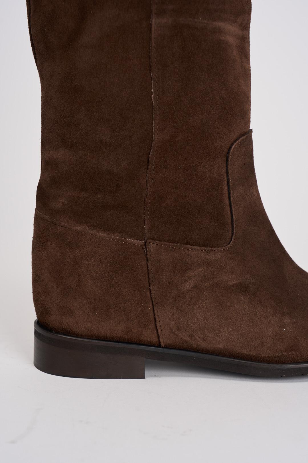 DIVINE FOLLIE Stivale donna in camoscio marrone. Stivale lungo sotto al ginocchio in camoscio marrone. Rialzo interno. Tacco 3 cm. Calzata regolare. Vera pelle.