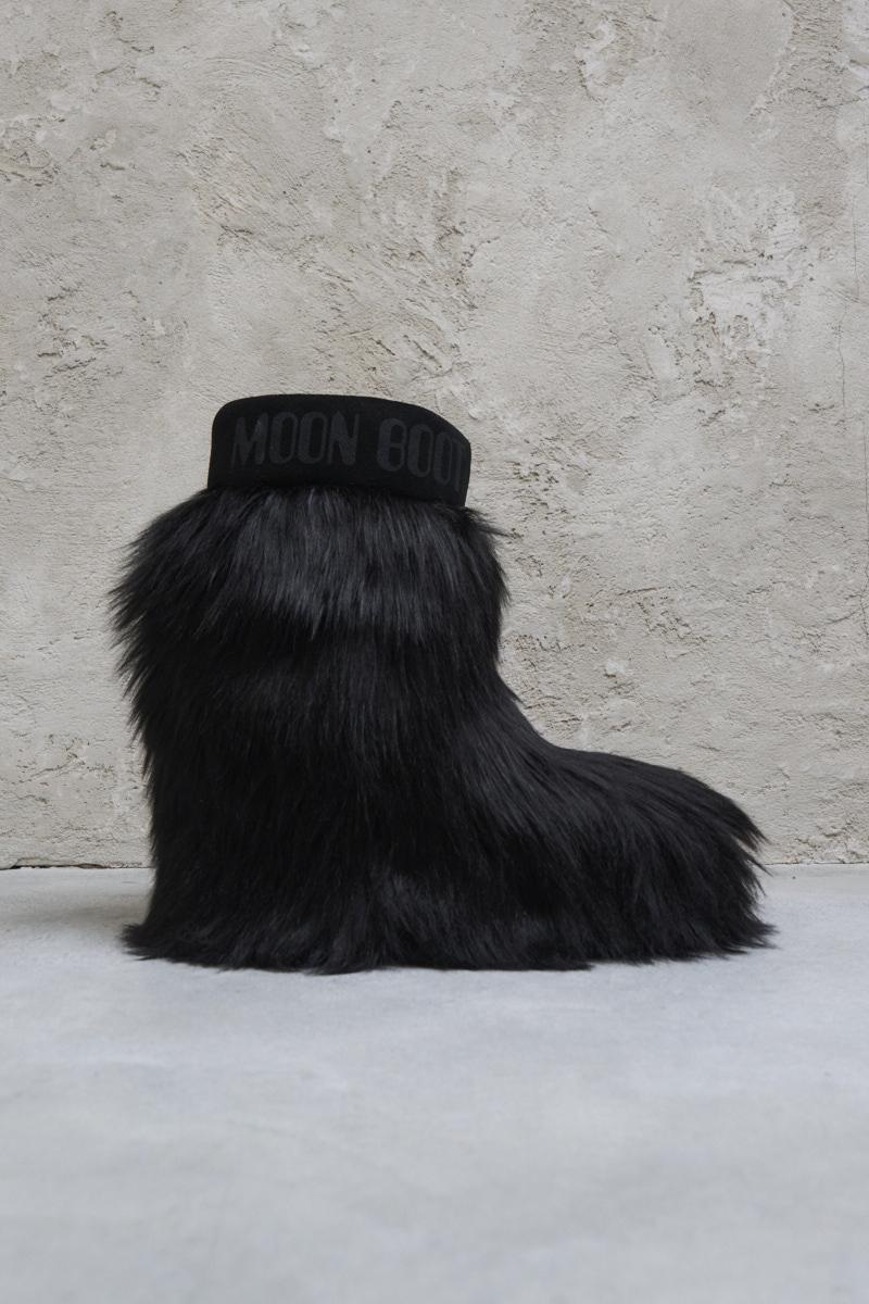 MOON BOOT Stivale donna "Icon Yeti" nero. Modello mid. Tomaia in finta pelliccia. Inserto con logo e motivo a righe sull'orlo. Intersuola in gomma termoplastica (TR). Battistrada in gomma antiscivolo. Modello slip-on