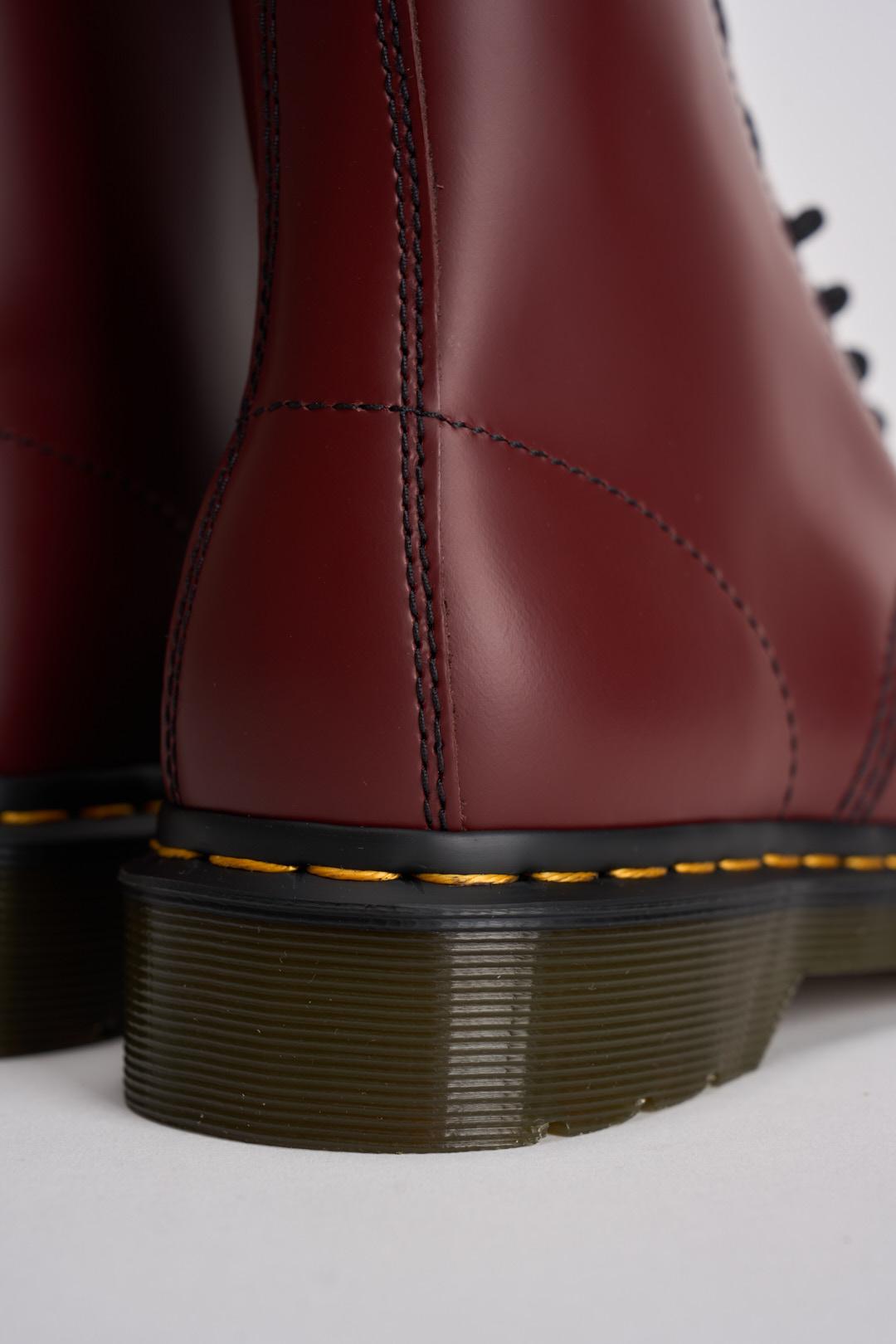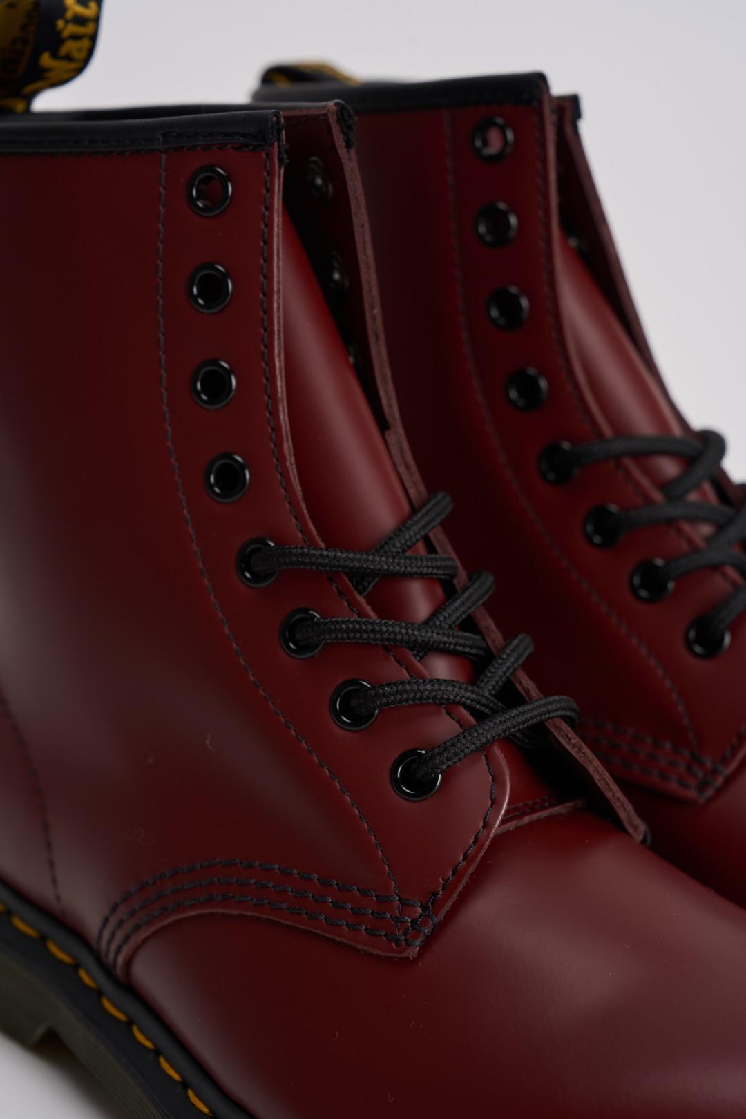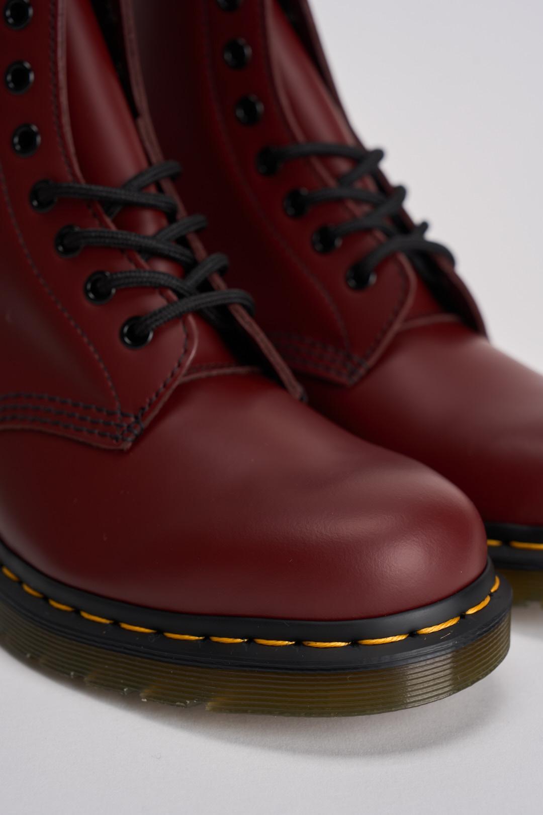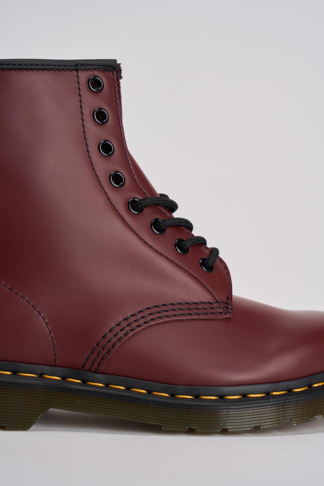 DR.MARTENS Stivale stringato donna 1460 bordeaux. Modello a 8 occhielli, suola scanalata e linguetta AirWair. Cuciture gialle punta larga, arrotondata e suola con cuscinetto d'aria. Composizione: 100% pelle Smooth. Calzata regolare.