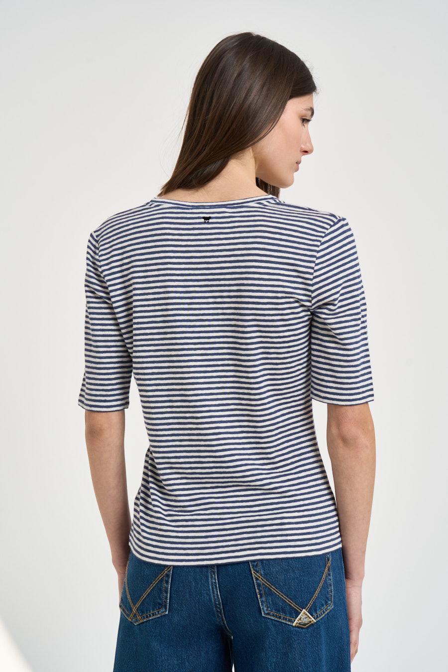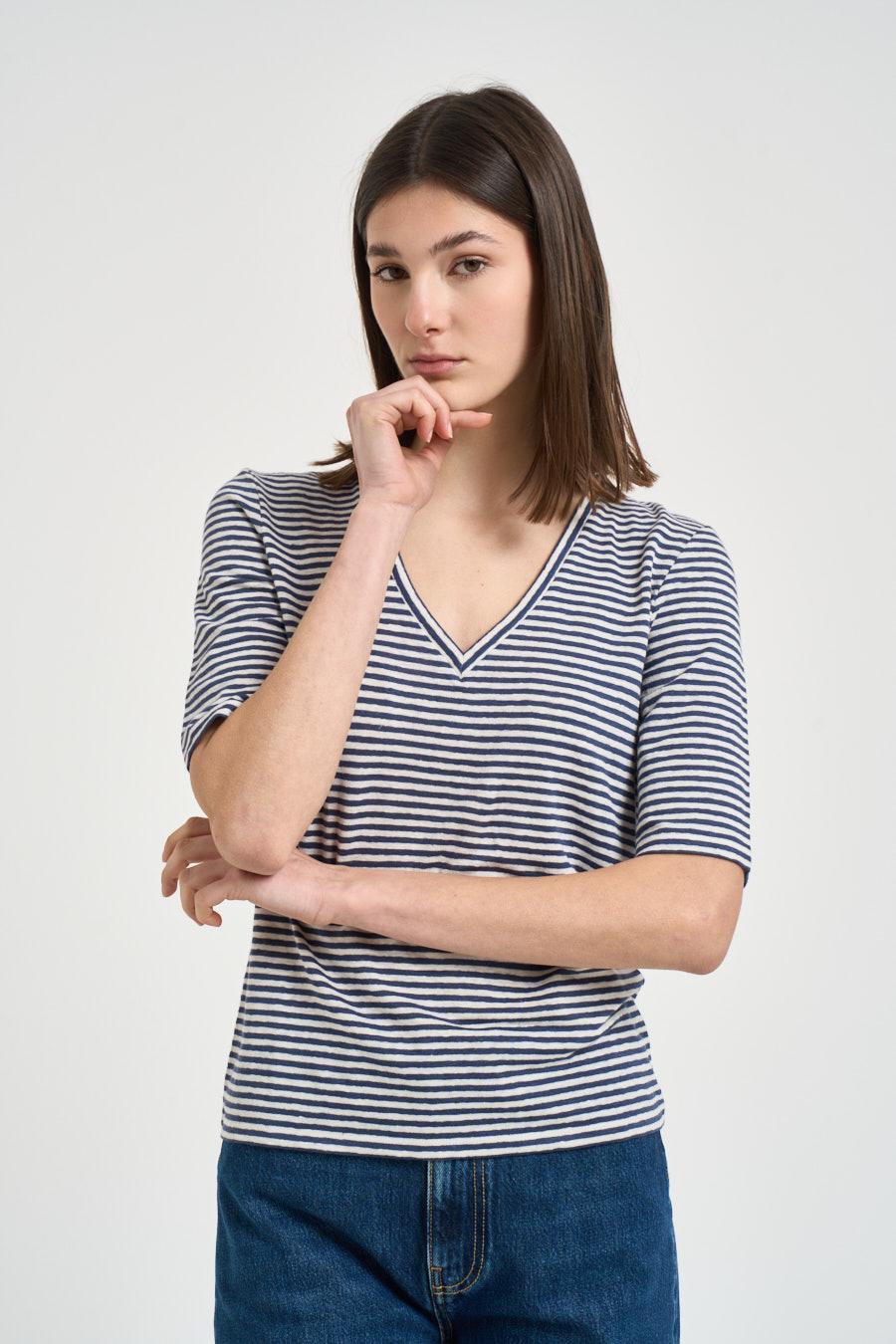 MAX MARA WEEKEND T-shirt donna a righe blu e bianca. Modello dalla vestibilità regular. Righe orizzontali. Scollo a V. Manica corta. Composizione: 95% lino, 5% elastane. La modella è alta 176 cm e indossa la taglia S.