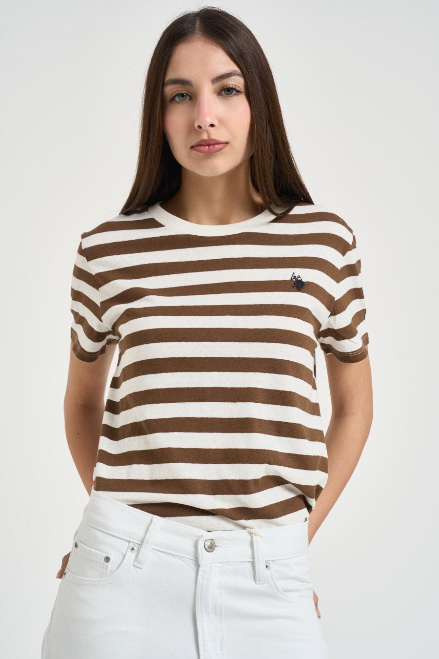 U.S. POLO T-shirt donna a righe marrone e bianco. Modello girocollo in jersey con motivo a righe orizzontali, caratterizzato da vestibilità regolare e maniche corte per un comfort quotidiano. Tessuto morbido e leggero. Presente logo ricamato a contrasto sul petto. Composizione: 70%cotone 30%lino. La modella è alta 176cm e indossa la taglia S.