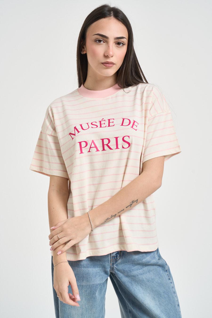 VICOLO T-shirt donna a righe rosa. Modello a maniche corte con stampa frontale Musee de Paris. Composizione: 100%cotone. La modella è alta 172cm e indossa la taglia UNI.