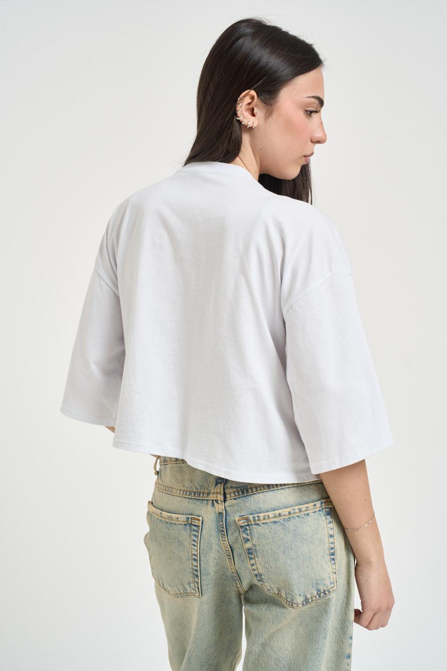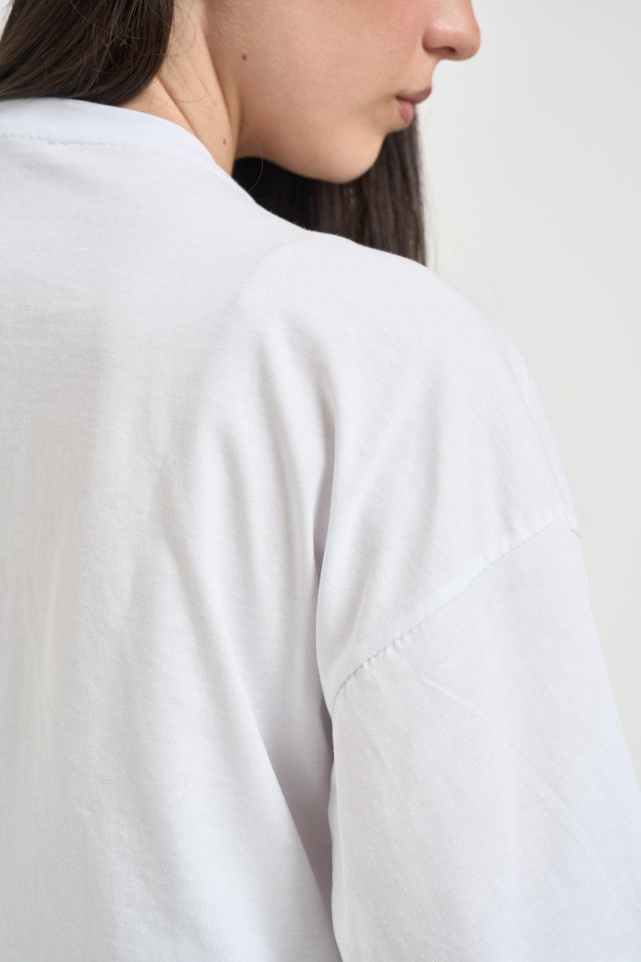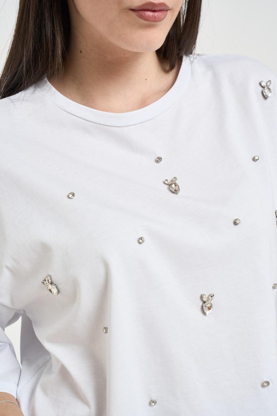 TWO WAY T-shirt donna applicazioni gioiello bianca. Modello girocollo con linea cropped e vestibilità morbida, caratterizzato da maniche corte ampie. Il capo è impreziosito da piccole applicazioni gioiello distribuite davanti. Composizione: 100% Cotone. La modella è alta 172 cm e indossa la taglia UNI.