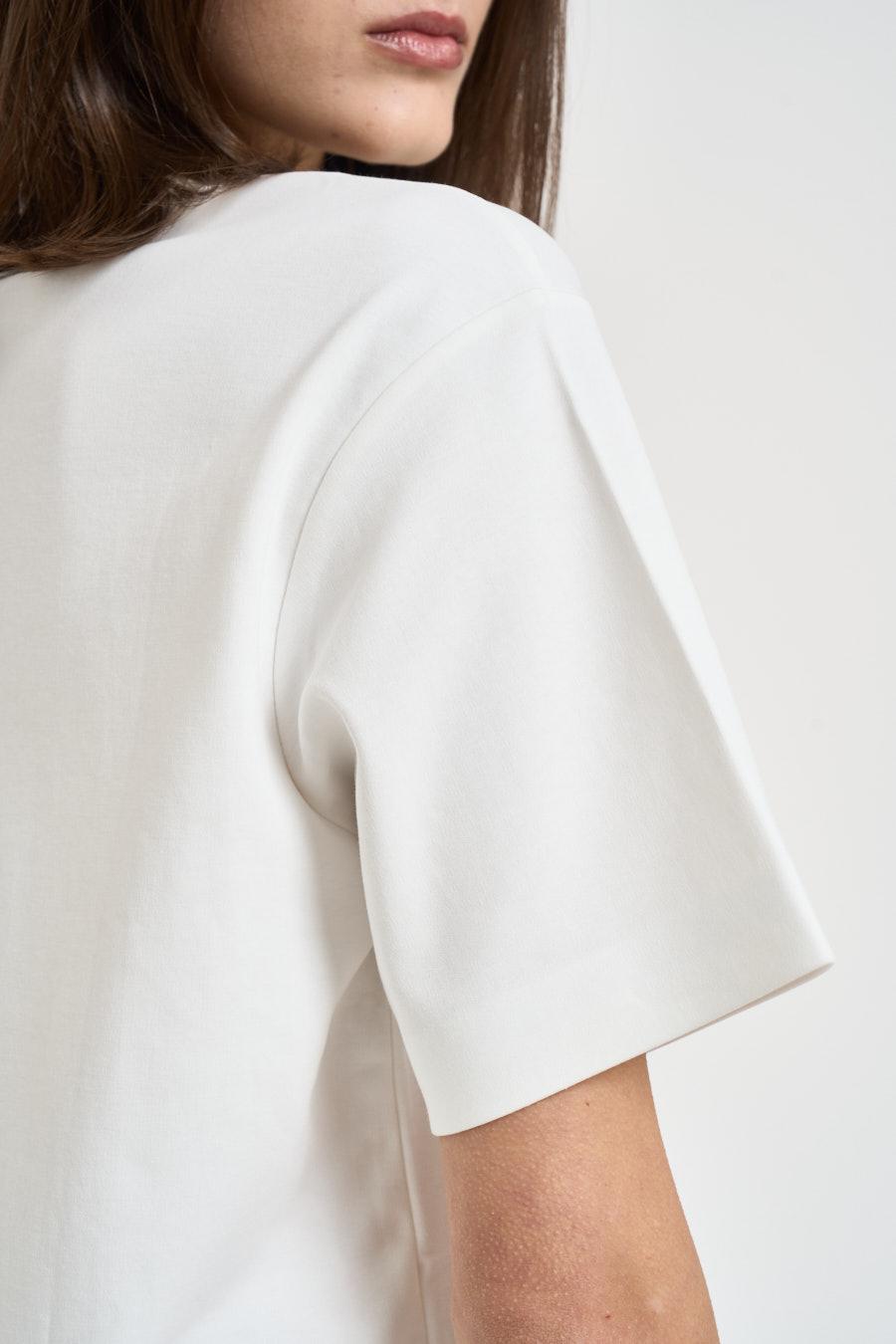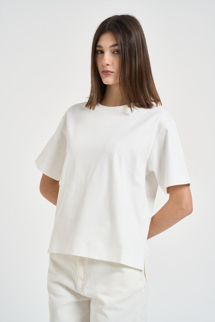 MAX MARA WEEKEND T-shirt donna bianca in jersey. Modello girocollo e maniche corte dalla linea boxy. Piccoli spacchi laterali e fondo asimmetrico. Composizione: 100% cotone. La modella è alta 176cm e indossa la taglia S.