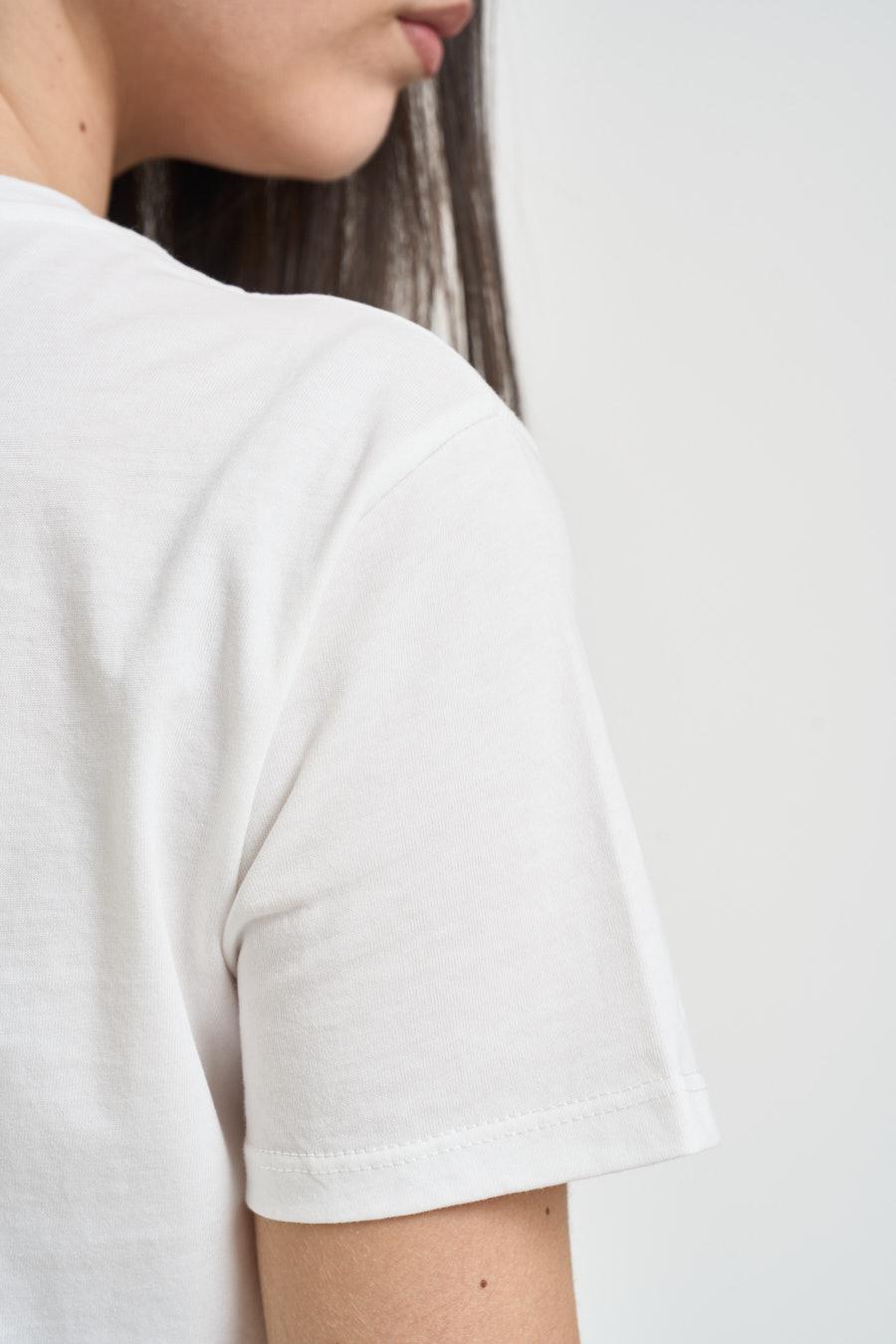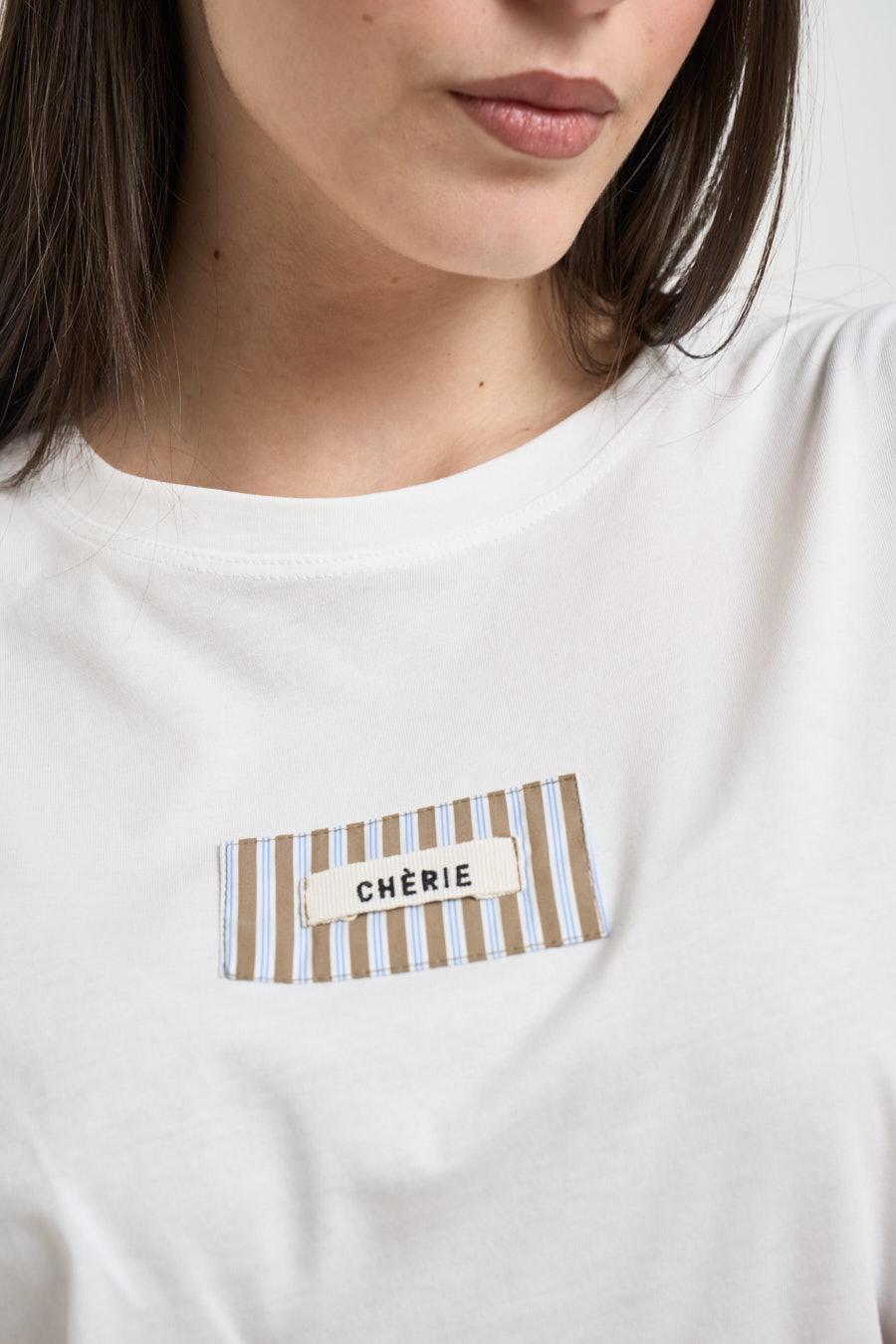 VICOLO T-shirt donna bianca. Modello a maniche corte con girocollo e linea essenziale. Il capo presenta una stampa frontale minimal con dettaglio grafico a righe e scritta CHÉRIE applicata sul petto, che dona un tocco distintivo e contemporaneo. Tessuto leggero e confortevole, ideale per look casual e quotidiani. Fit regolare. Composizione: 100% cotone. La modella è alta 172cm e indossa la taglia UNI.