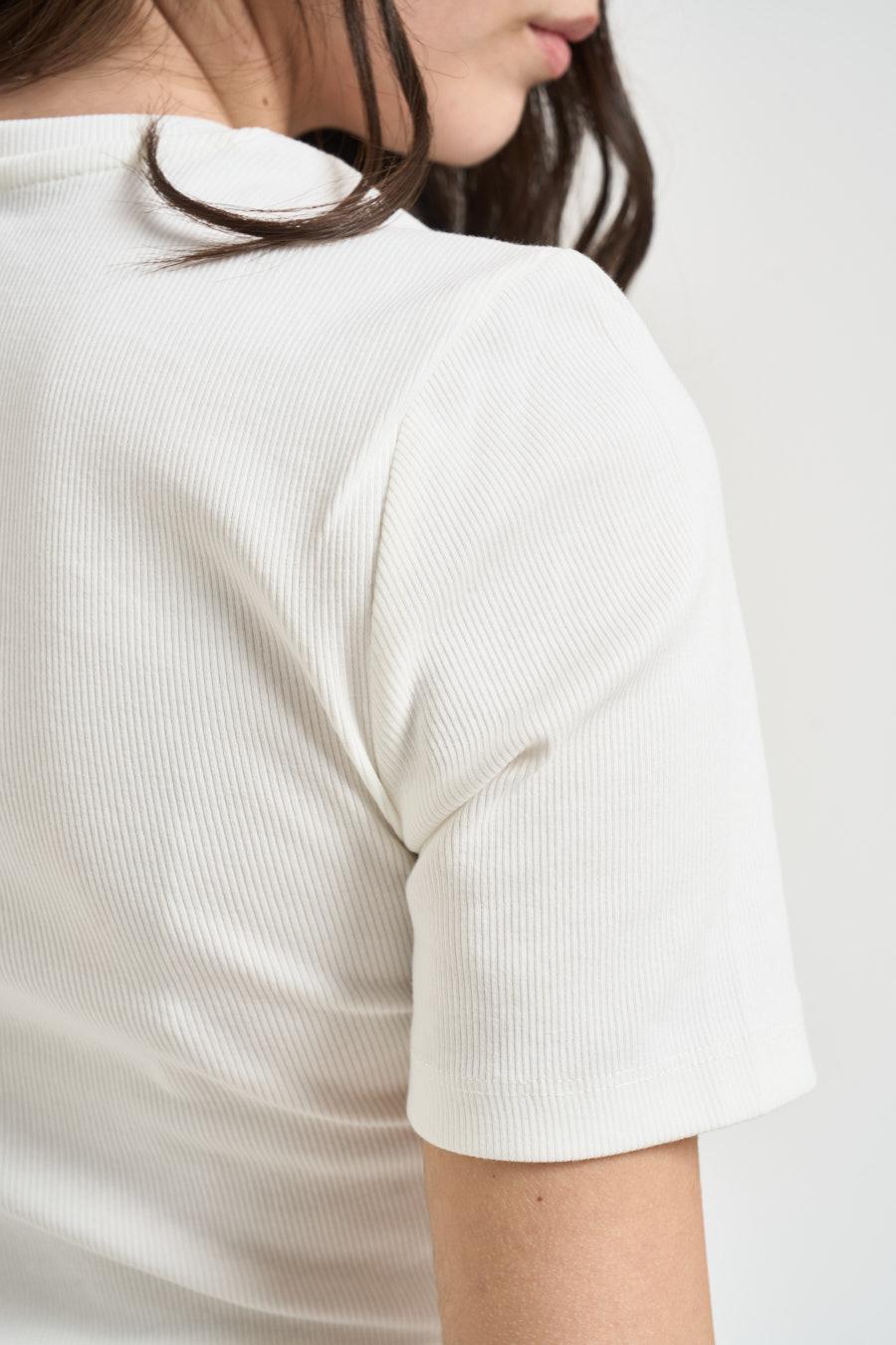 ONLY T-shirt donna con fiocchetti bianca. Modello slim fit. Realizzata in tessuto elasticizzato a costine. Presenta uno scollo girocollo e una lunghezza leggermente cropped. Il capo è impreziosito da piccoli dettagli decorativi a forma di fiocchetti tono su tono. Composizione: 95% cotone, 5% elastane. La modella è alta 172 cm e indossa la taglia S.