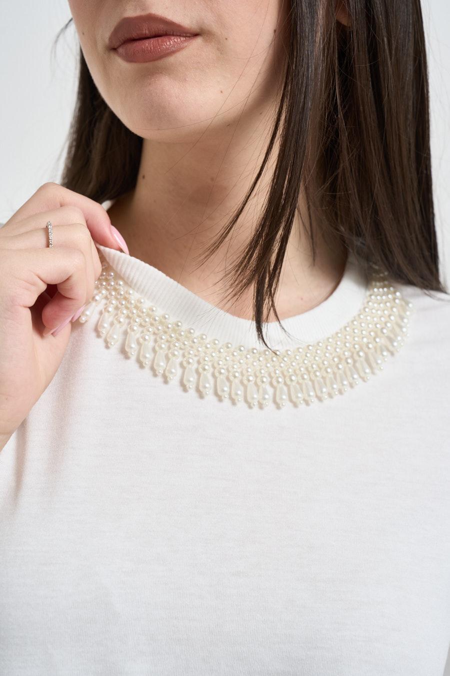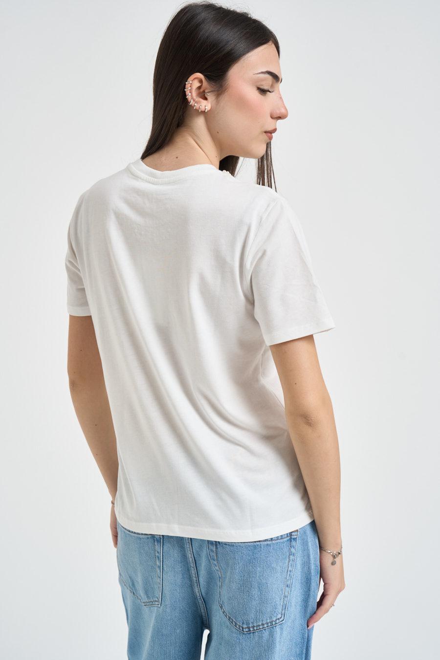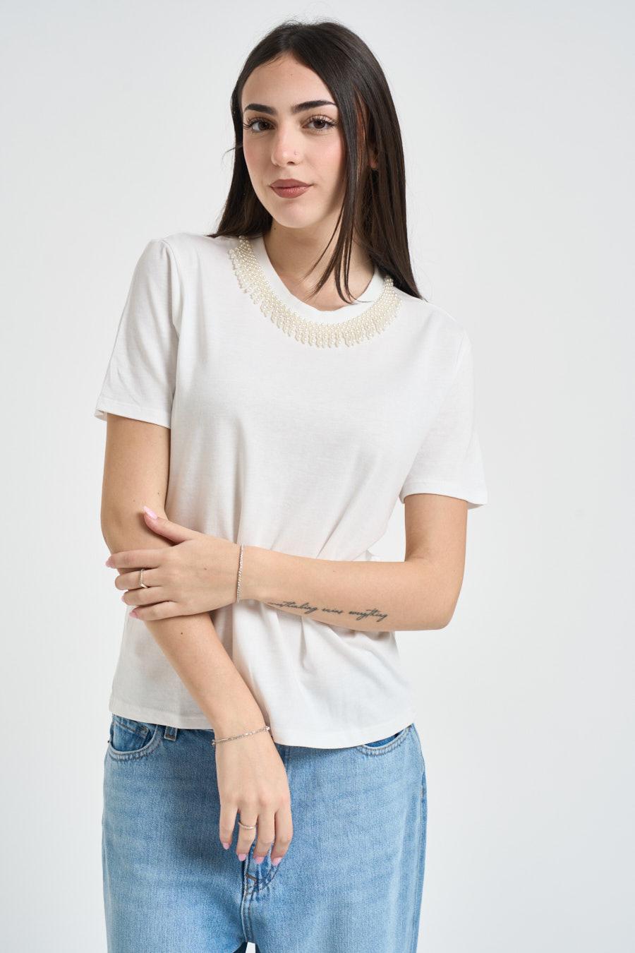ONLY T-shirt donna con gioiello bianca. Modello regular fit. Manica corta. Dettaglio su girocollo. Composizione: 100% cotone. La modella è alta 172 cm e indossa la taglia S.