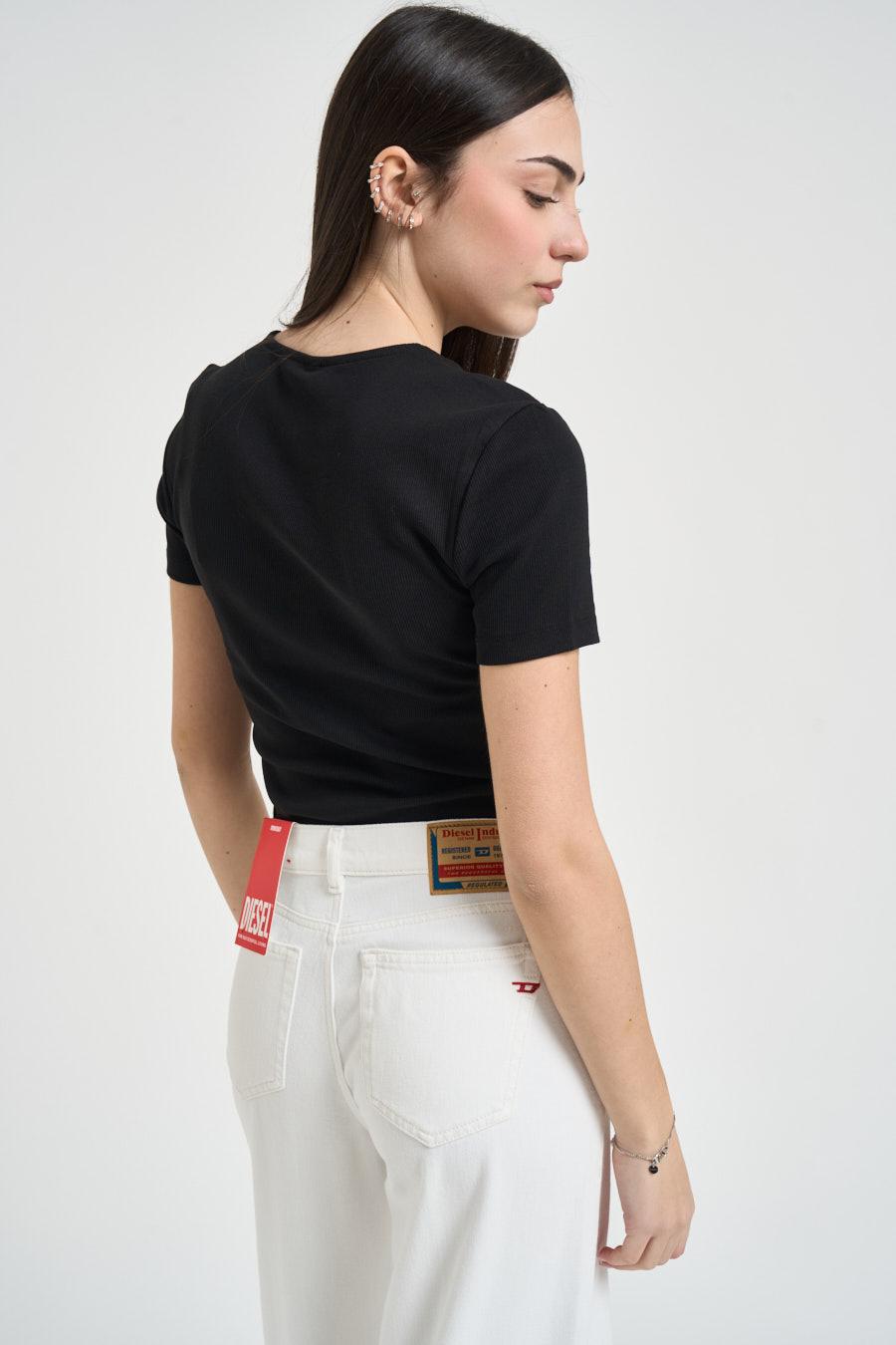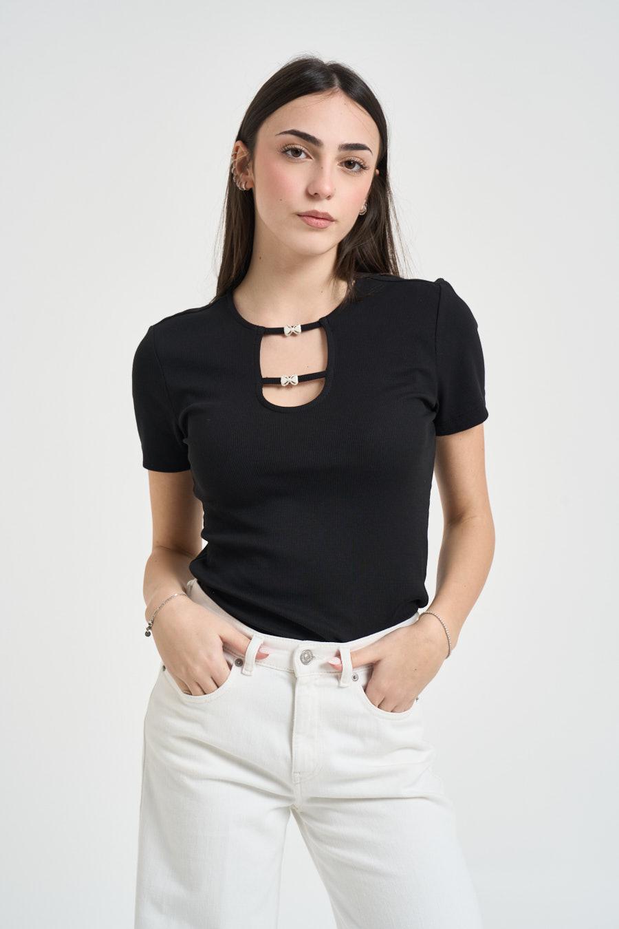 ONLY T-shirt donna con gioiello nera. Modello aderente in tessuto a costine, maniche corte e scollo tondo con dettaglio cut-out e doppio fiocco gioiello. Composizione: 100% cotone. La modella è alta 172cm e indossa la taglia S.