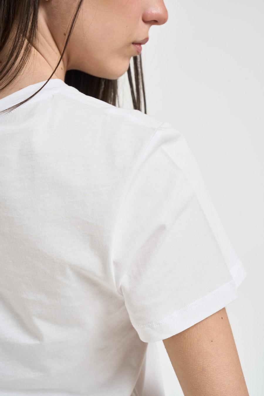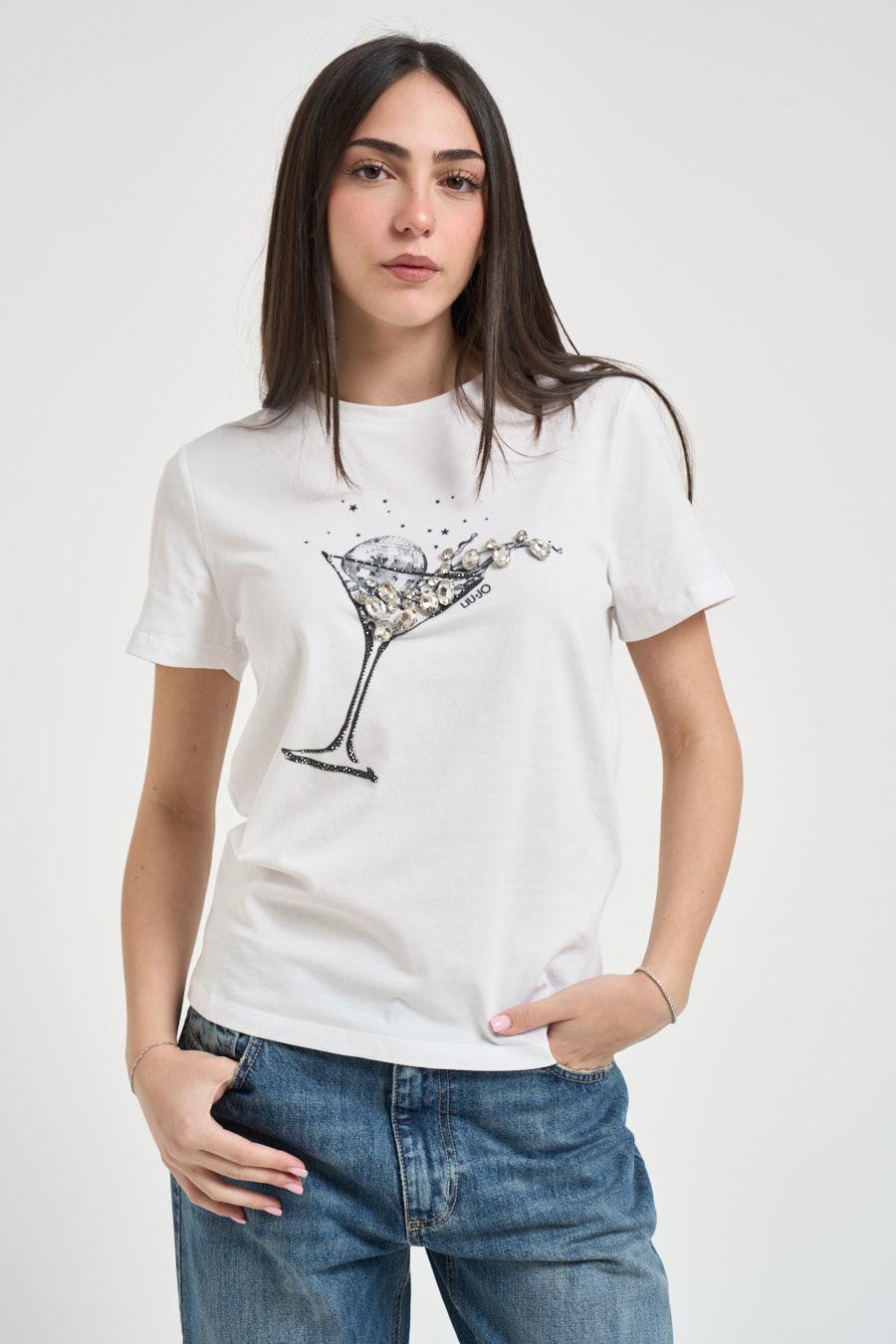 LIU JO T-shirt donna con stampa bianca. Modello regular fit. Stampa frontale con dettagli di strass. Manica corta. Girocollo. Composizione: 100% cotone. La modella è alta 172 cm e indossa la taglia XS.