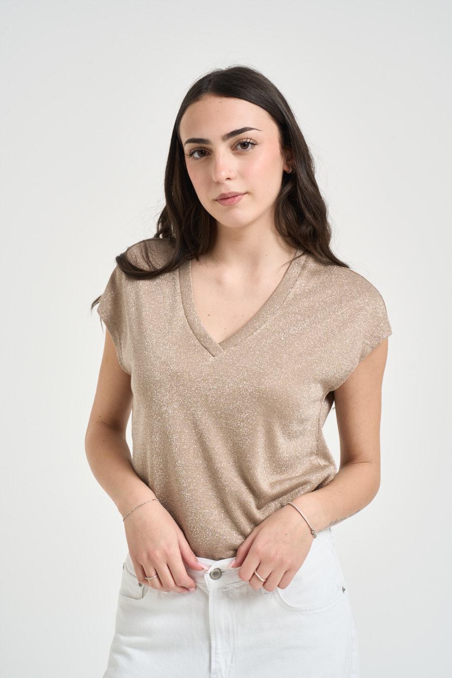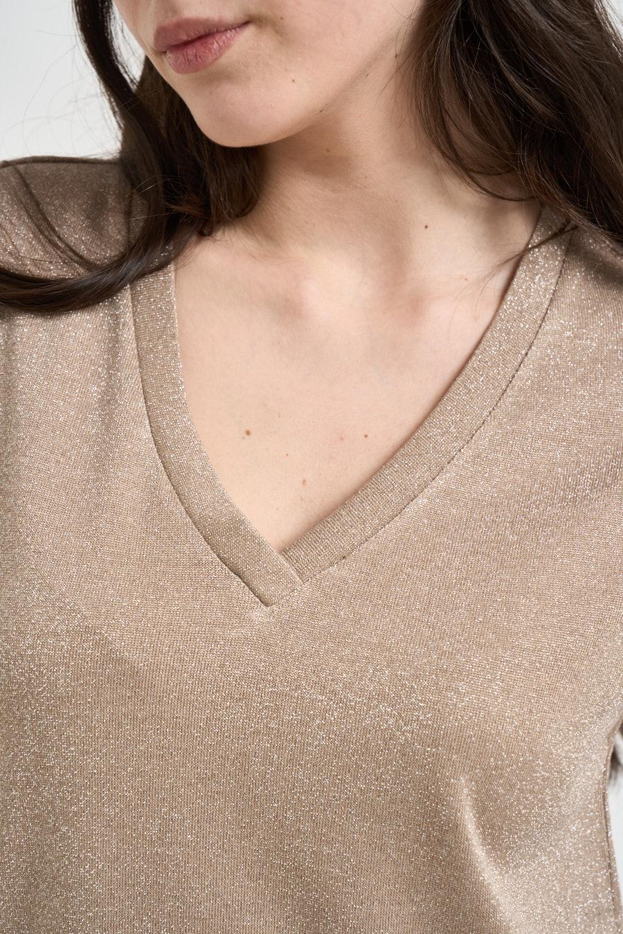 GRACE AND MILA T-shirt donna effetto lurex beige dorato. Modello con scollo a V e maniche corte a kimono, caratterizzato da una texture brillante con filati luminosi che donano un elegante effetto shimmer. Collo e bordi rifiniti con cuciture tono su tono. Composizione: 75%viscosa 25% lurex. La modella è alta 172 cm e indossa la taglia S.