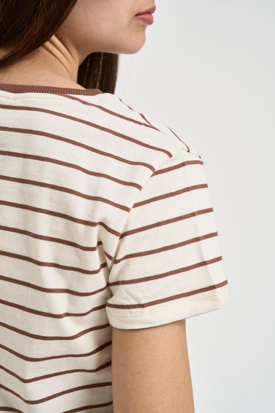 VICOLO T-shirt donna girocollo a righe marrone. Modello a manica corta, regular fit. Composizione: 100%cotone. La modella è alta 176 cm e indossa la taglia UNI.