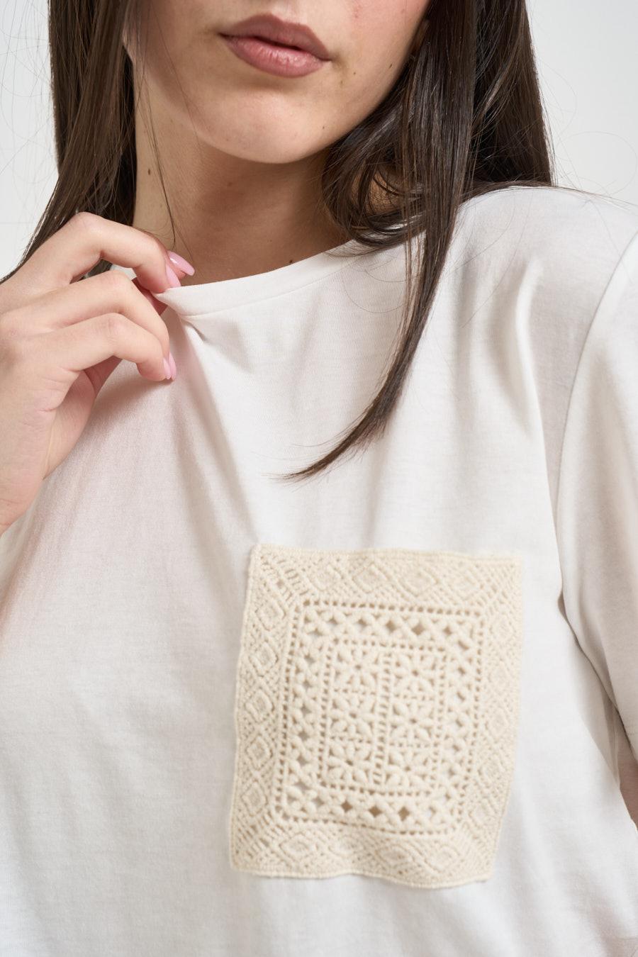 ONLY T-shirt donna girocollo bianca. Modello regular fit. Manica corta. Girocollo. Patch ricamata sul lato sinistro del petto. Composizione: 100% cotone. La modella è alta 172 cm e indossa la taglia XS.