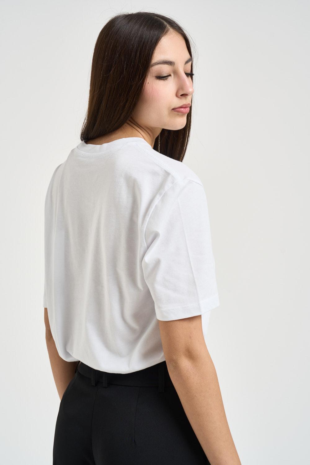 PATRIZIA PEPE T-shirt donna girocollo bianca. Modello a maniche corte con linea essenziale e vestibilità regolare. Sul davanti è presente una label applicata con logo iconico Fly. Composizione: 100% cotone. La modella è alta 176cm e indossa la taglia 1.