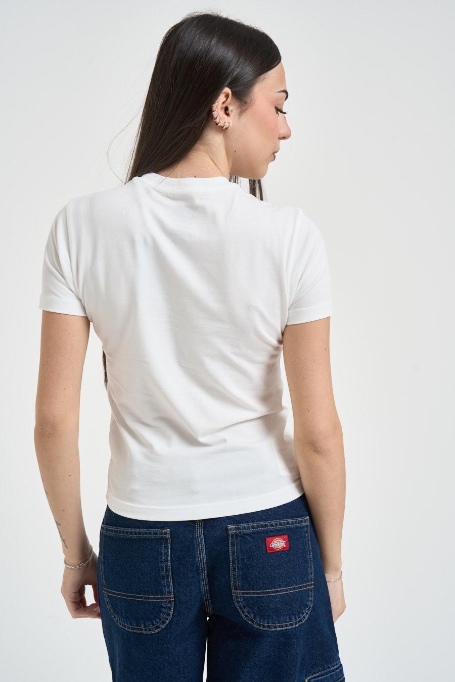 DICKIES T-shirt donna girocollo bianca con logo. Modello di cotone morbido, iconico logo Dickies ricamato sul davanti, maniche corte. Orlo dritto. Composizione: 95% Cotone 5% Elastan. La modella è alta 172cm e indossa la taglia S.