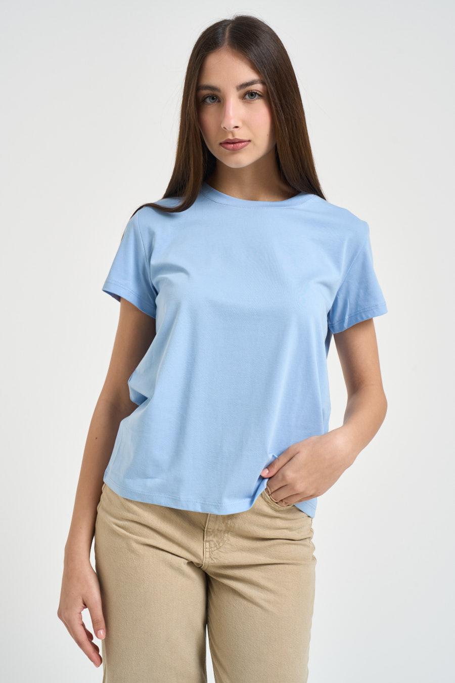 SUSY MIX T-shirt donna girocollo celeste. Modello regular fit. Manica corta. Composizione: 100% cotone. La modella è alta 176 cm e indossa la taglia UNI.