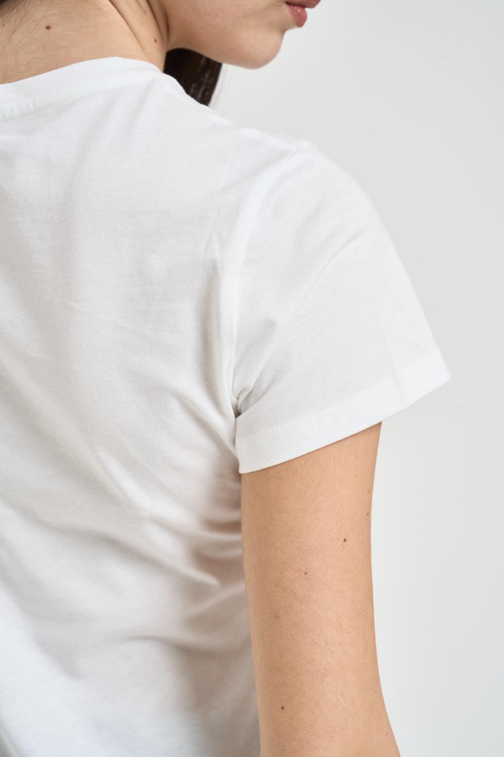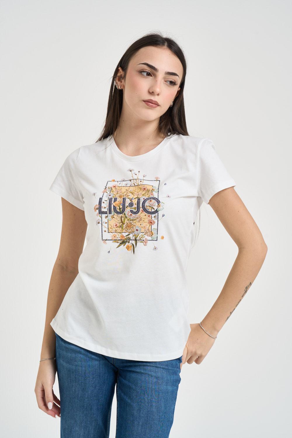 LIU JO T-shirt donna girocollo con strass bianca. Modello a maniche corte sul davanti, stampa impreziosita dal logo Liu Jo centrale a contrasto. Finiture con collo a costine e fondo dritto. Composizione: 100% cotone. La modella è alta 172cm e indossa la taglia S.