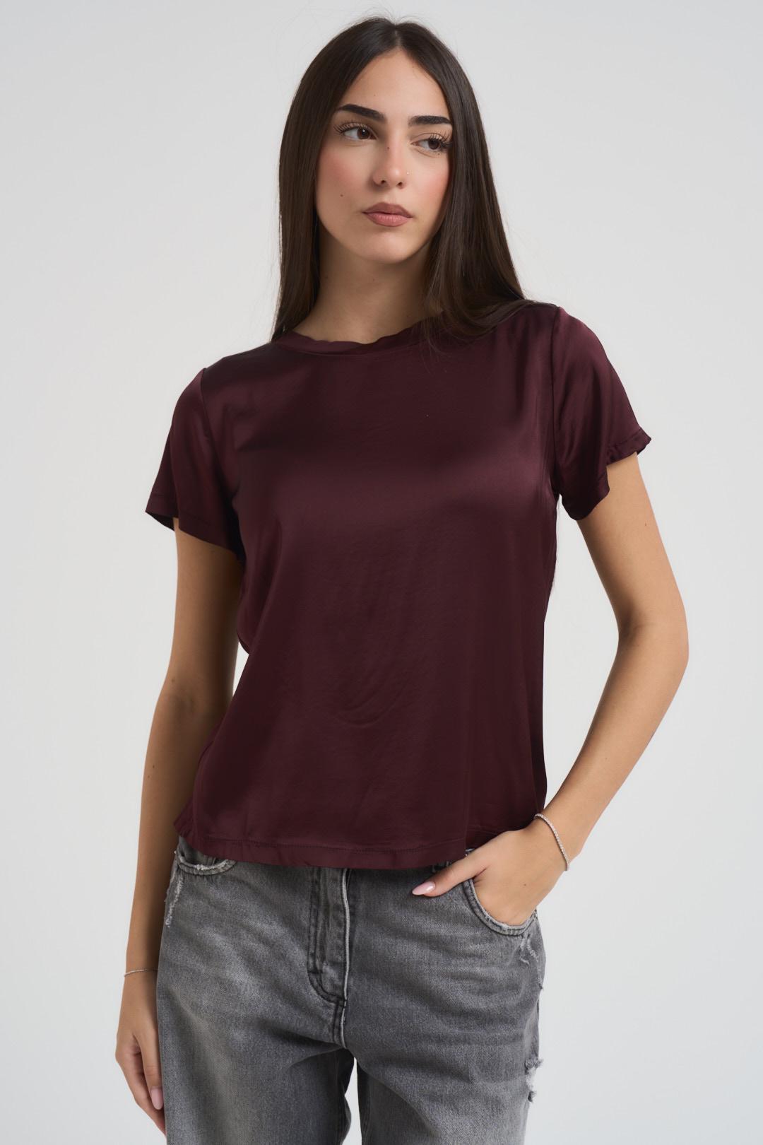 VITTO T-shirt donna girocollo satinata bordeaux. Modello a manica corta fluido. Composizione: 100% viscosa. La modella è alta 172cm e indossa la taglia S/M.