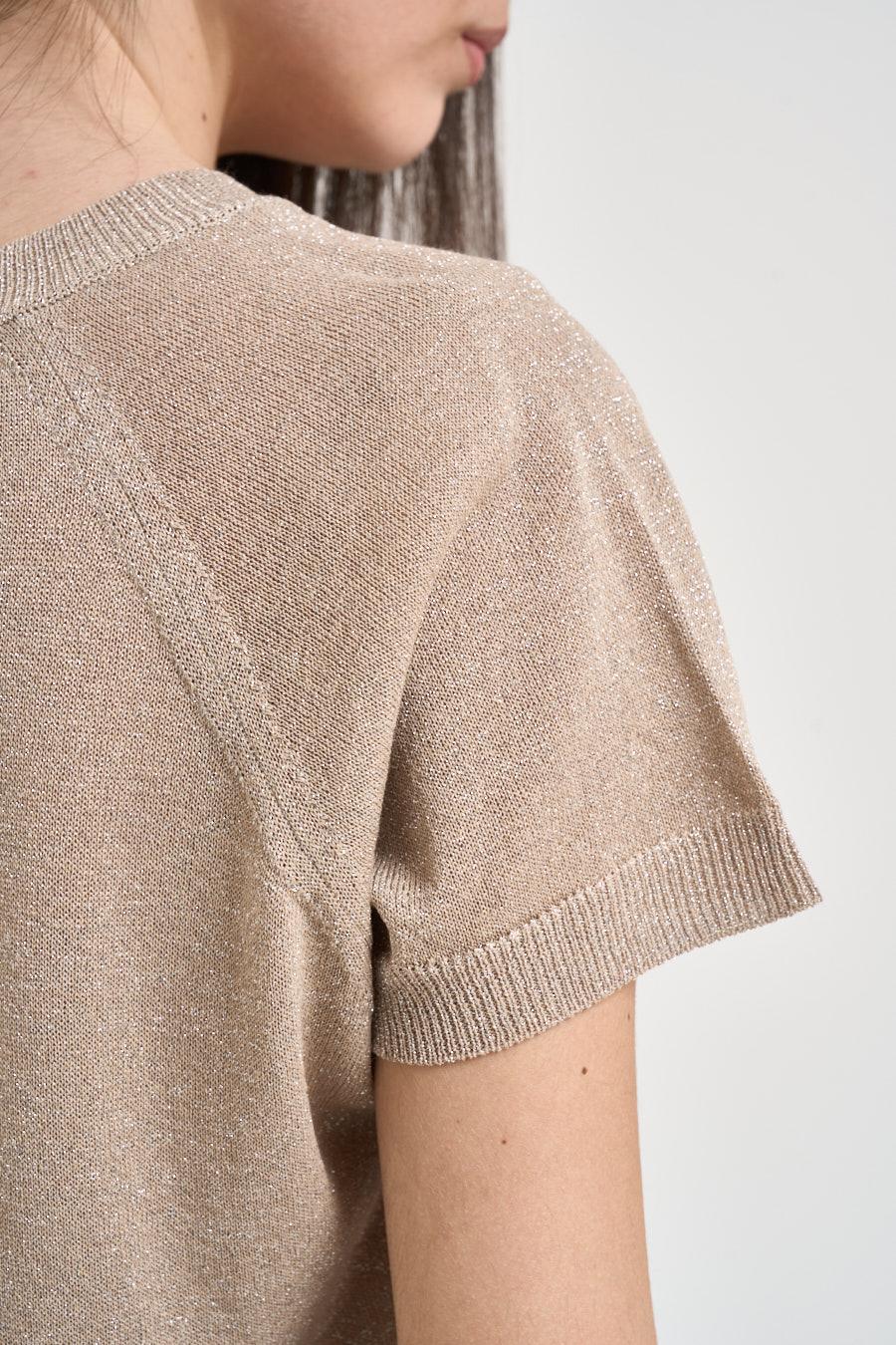 VICOLO T-shirt donna in maglia oro. Modello regular fit. Manica corta. Girocollo. Vestibilità morbida con maniche corte e struttura fluida. Collo, maniche e fondo rifiniti a costine. Composizione: 70% viscosa, 15% nylon, 15% poliestere. La modella è alta 172 cm e indossa la taglia UNI.