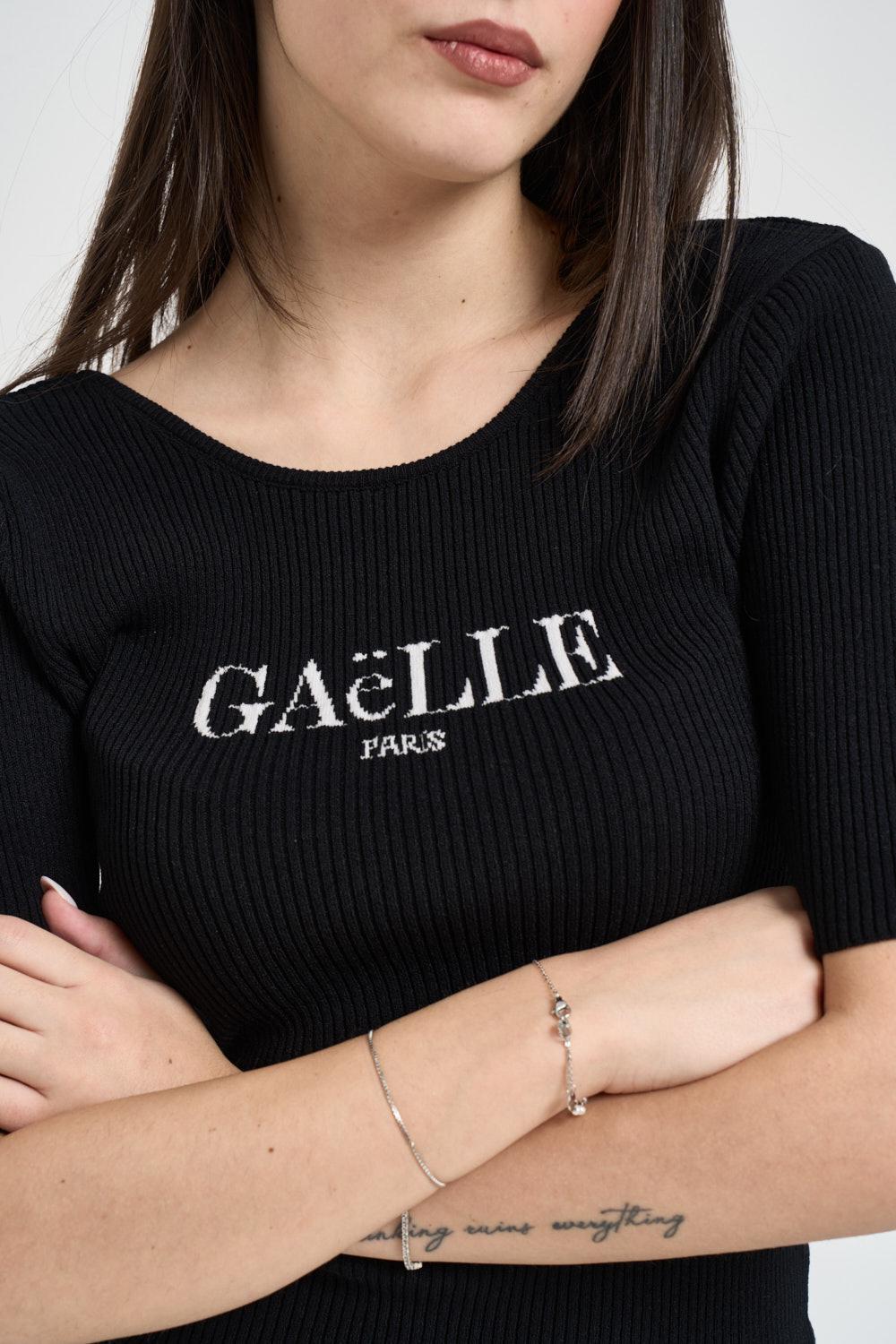 GAELLE T-shirt donna manica 3/4 nera. Modello girocollo con stamoa logo brand frontale in bianco. Composizione: 54%viscosa 28%poliestere 18%poliammide. La modella è alta 172 cm e indossa la taglia S.