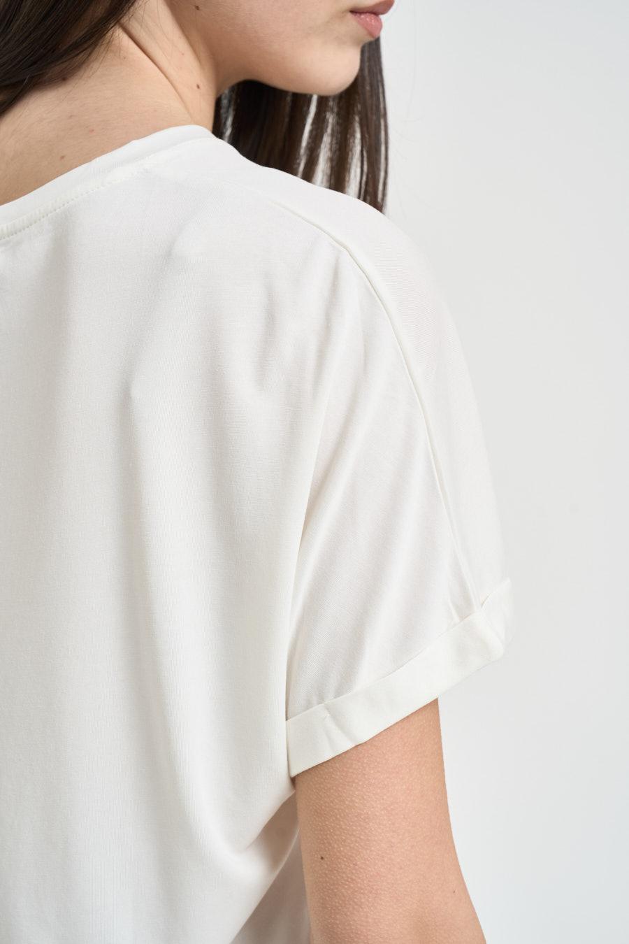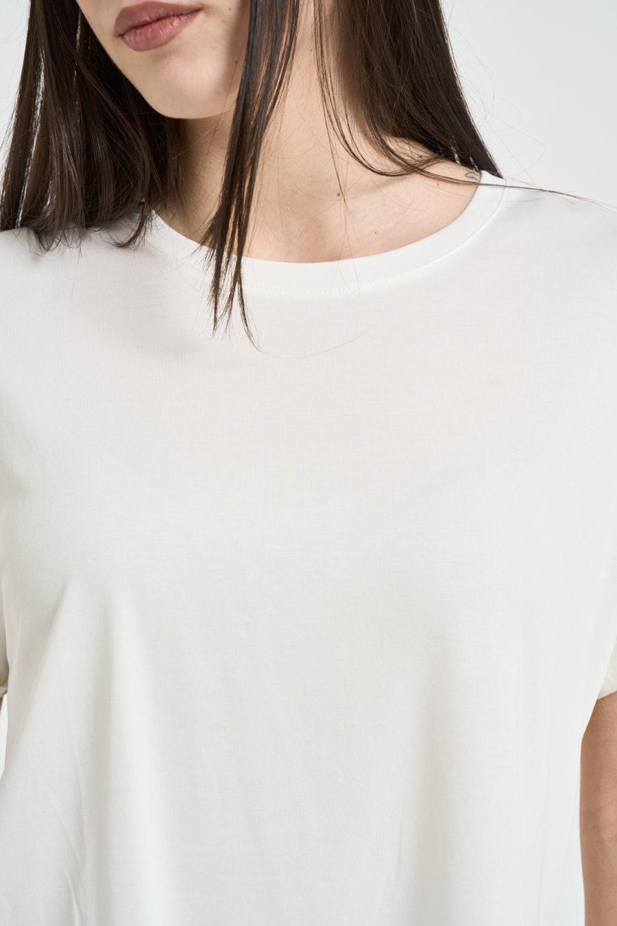 GRACE AND MILA T-shirt donna manica con risvolto bianca. Modello con taglio oversize. Ha maniche 3/4, spalle cadenti e scollo rotondo. Composizione: 70% Modal, 30% Polyester. La modella è alta 172 cm e indossa la taglia S.
