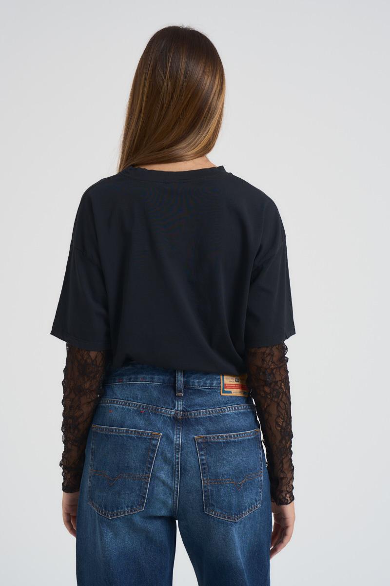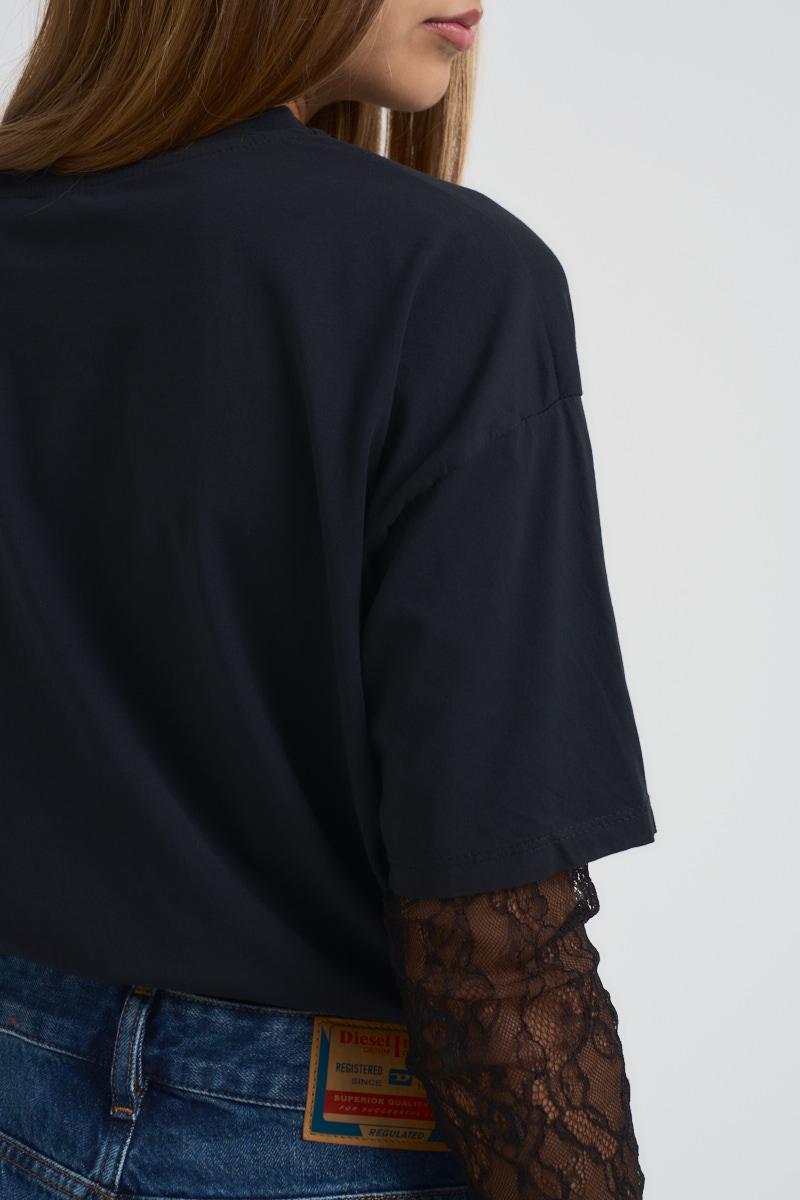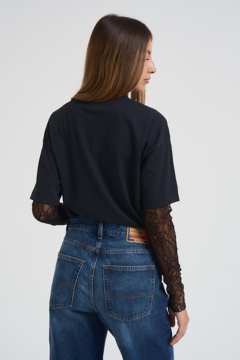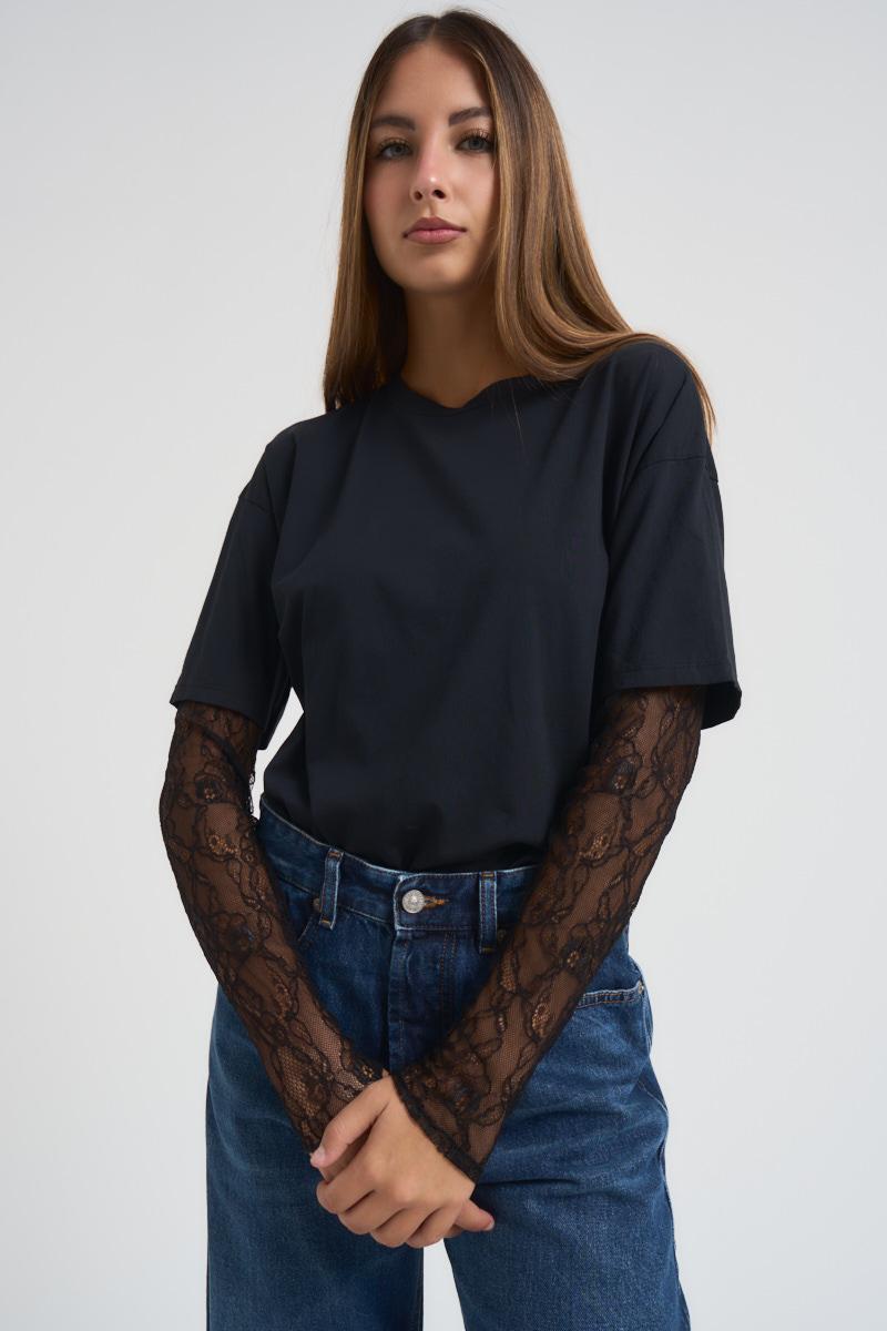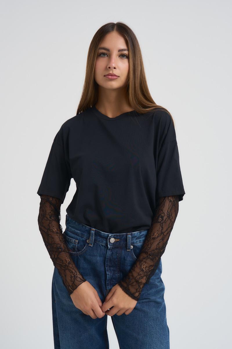 SUSY MIX T-shirt donna nera con maniche in pizzo. Modello a girocollo con maniche semitrasparenti in pizzo. Regular fit. Composizione: cotone e poliestere. La modella è alta 176cm e indossa la taglia unica.