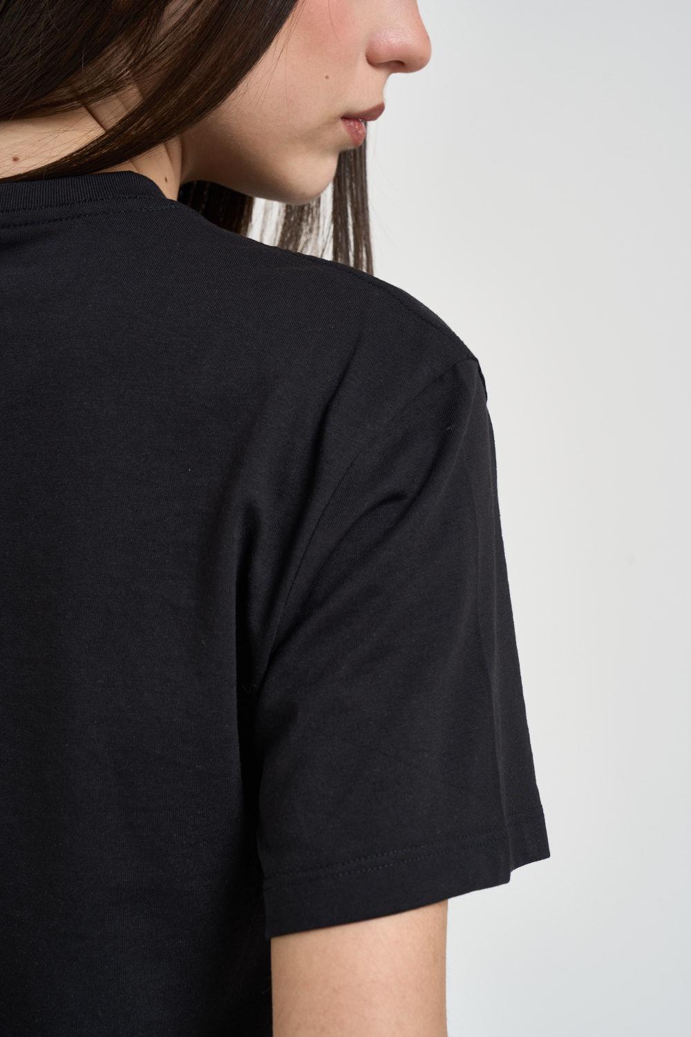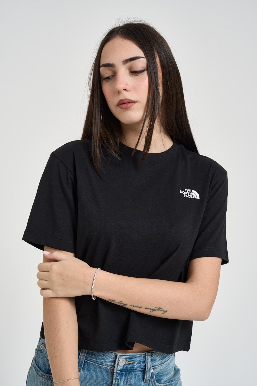 THE NORTH FACE T-shirt donna regular girocollo nera. Modello Essential Regular, manica corta con logo bianco sul petto a sinistra. Composizione: 100% cotone. La modella è alta 172 cm e indossa la taglia S.