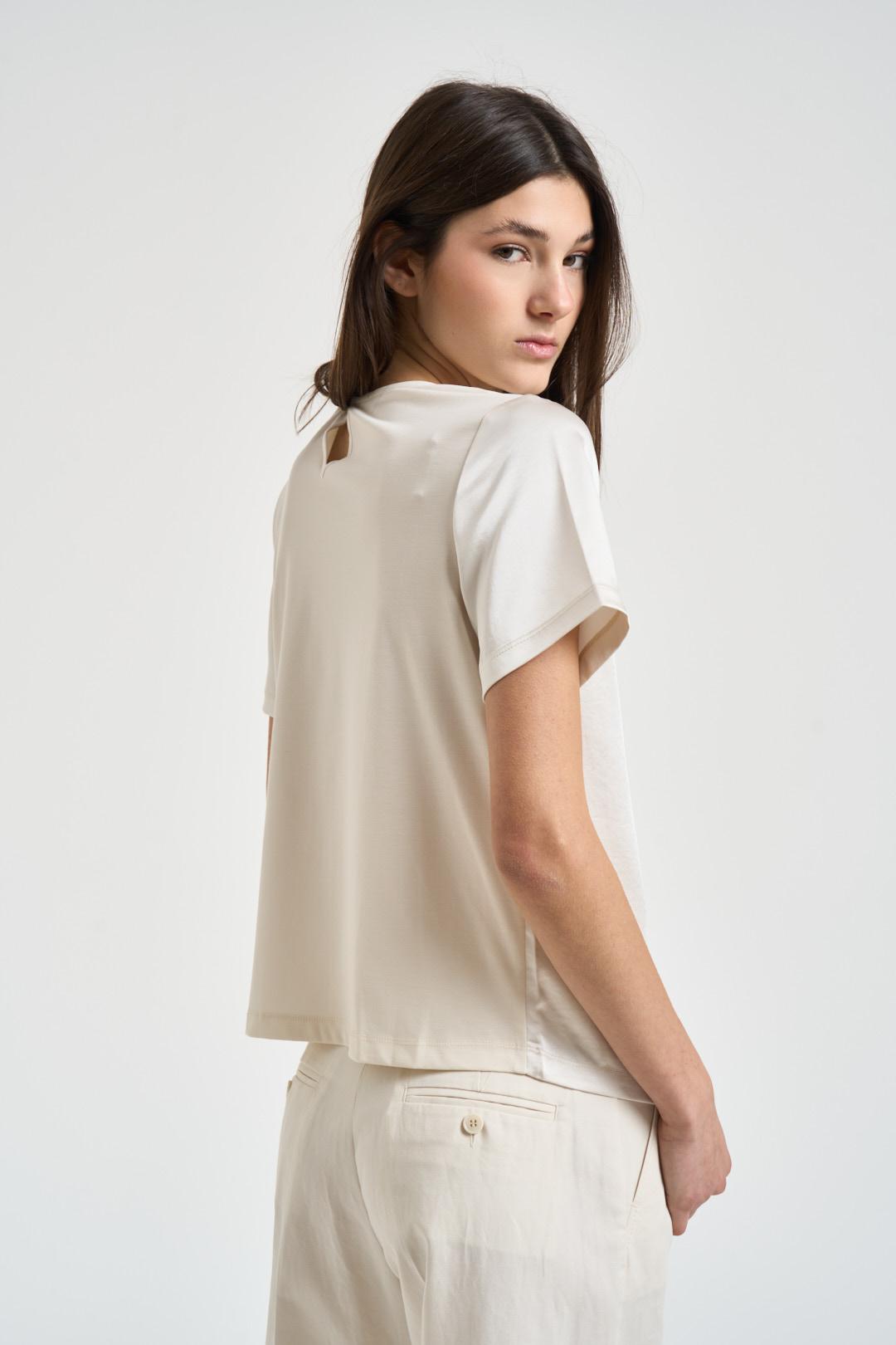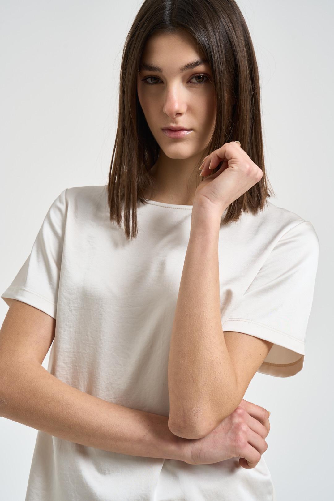 MAX MARA WEEKEND T-shirt donna satinata bianca. Modello a manica corta e vestibilità regolare. Scollo rotondo rifinito e piccolo dettaglio a goccia sul retro. Finiture pulite su fondo e maniche. Composizione: 100% poliestere. La modella è alta 176 cm e indossa la taglia S.