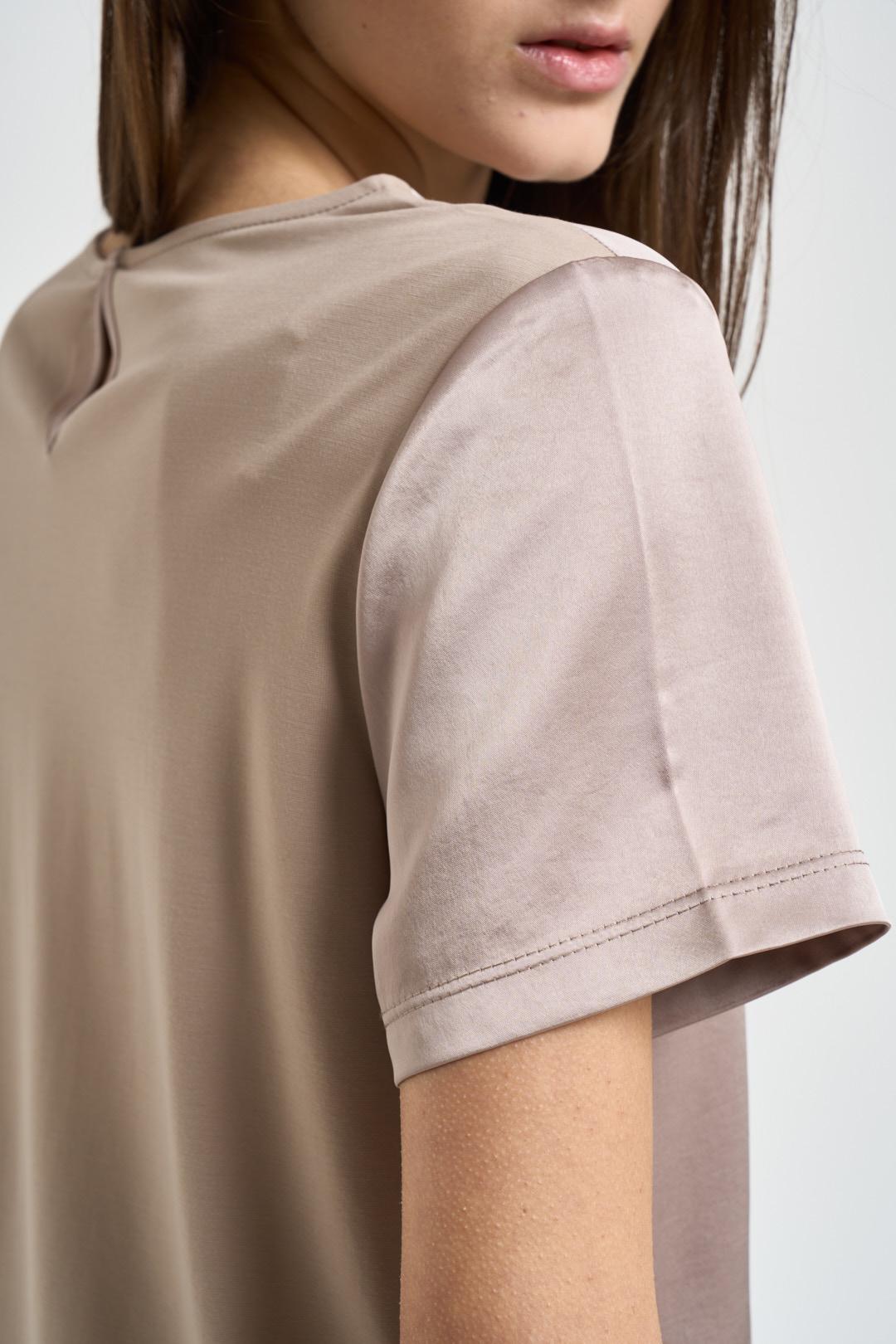 MAX MARA WEEKEND T-shirt donna satinata rosa. Modello a manica corta e vestibilità regolare. Scollo rotondo rifinito e piccolo dettaglio a goccia sul retro. Finiture pulite su fondo e maniche. Composizione: 100% poliestere. La modella è alta 176 cm e indossa la taglia S.