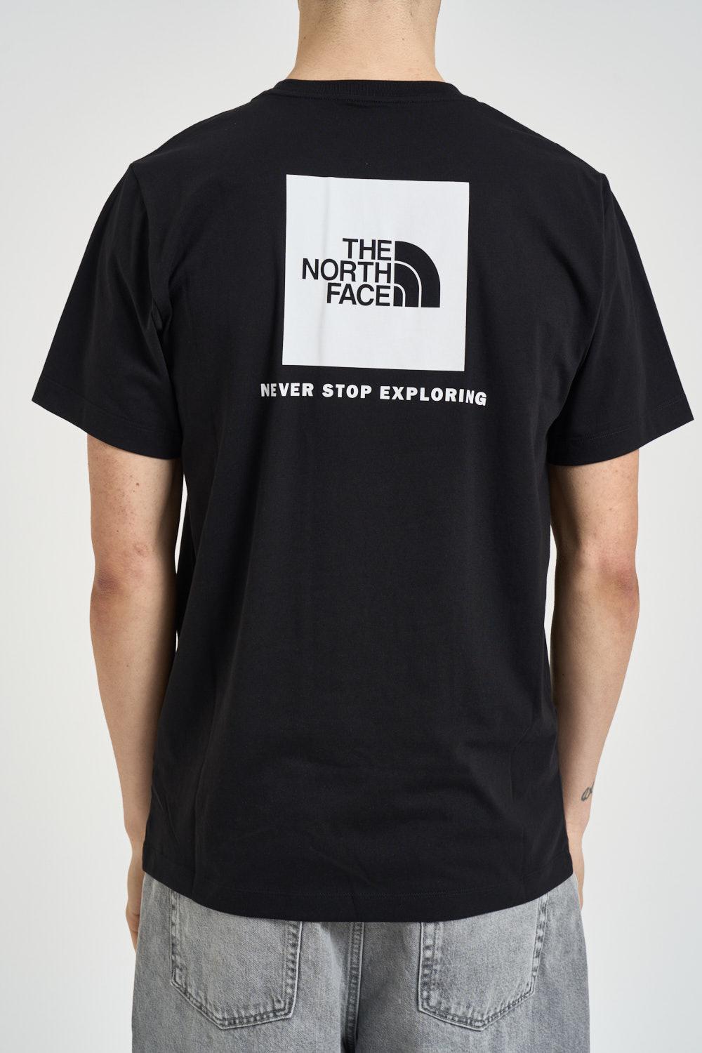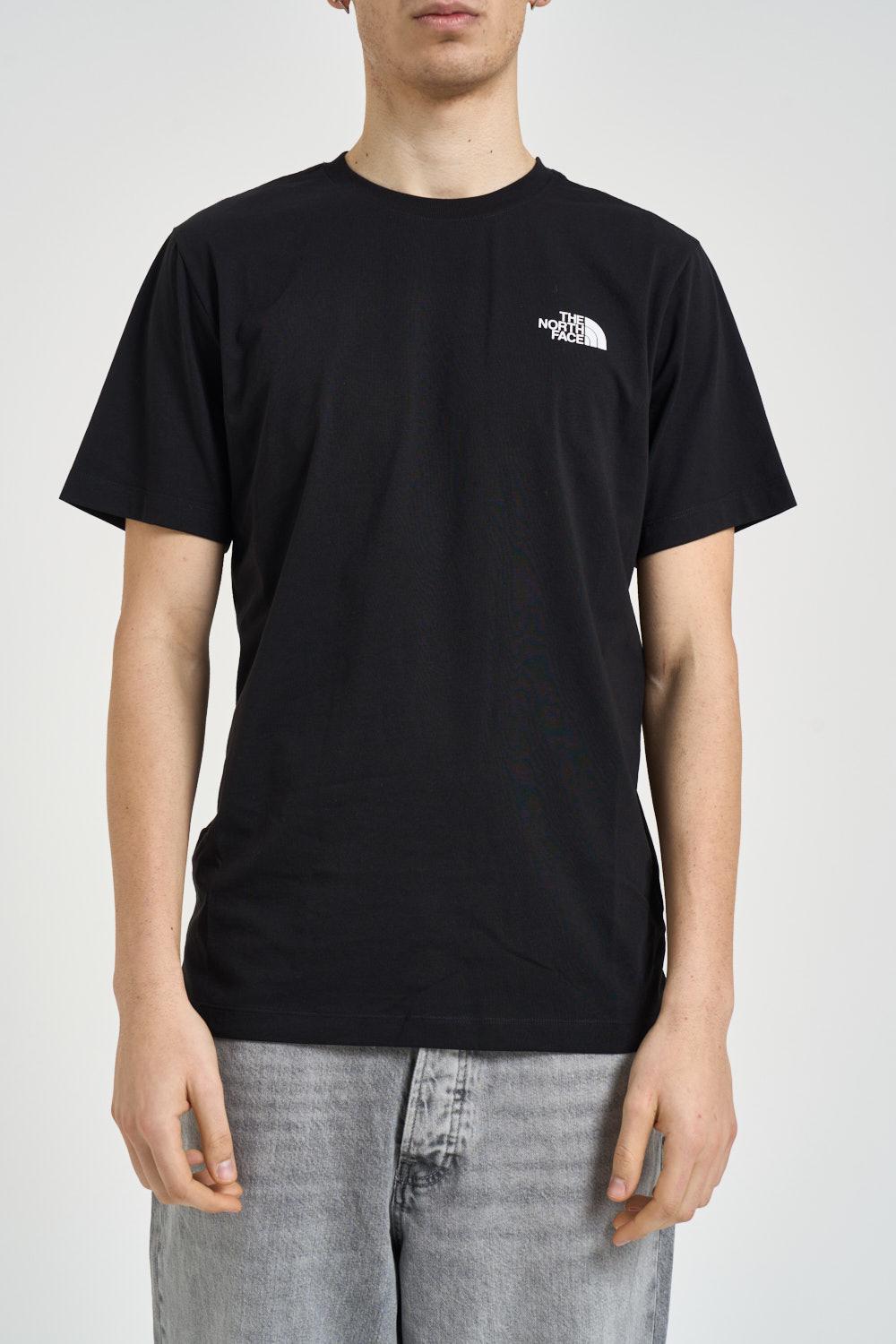 THE NORTH FACE T-shirt uomo girocollo nera. Modello a manica corta. Logo sul petto. Stampa sul retro. Composizione: 60% cotone, 40% poliestere. Il modello è alto 190cm e indossa la taglia L.