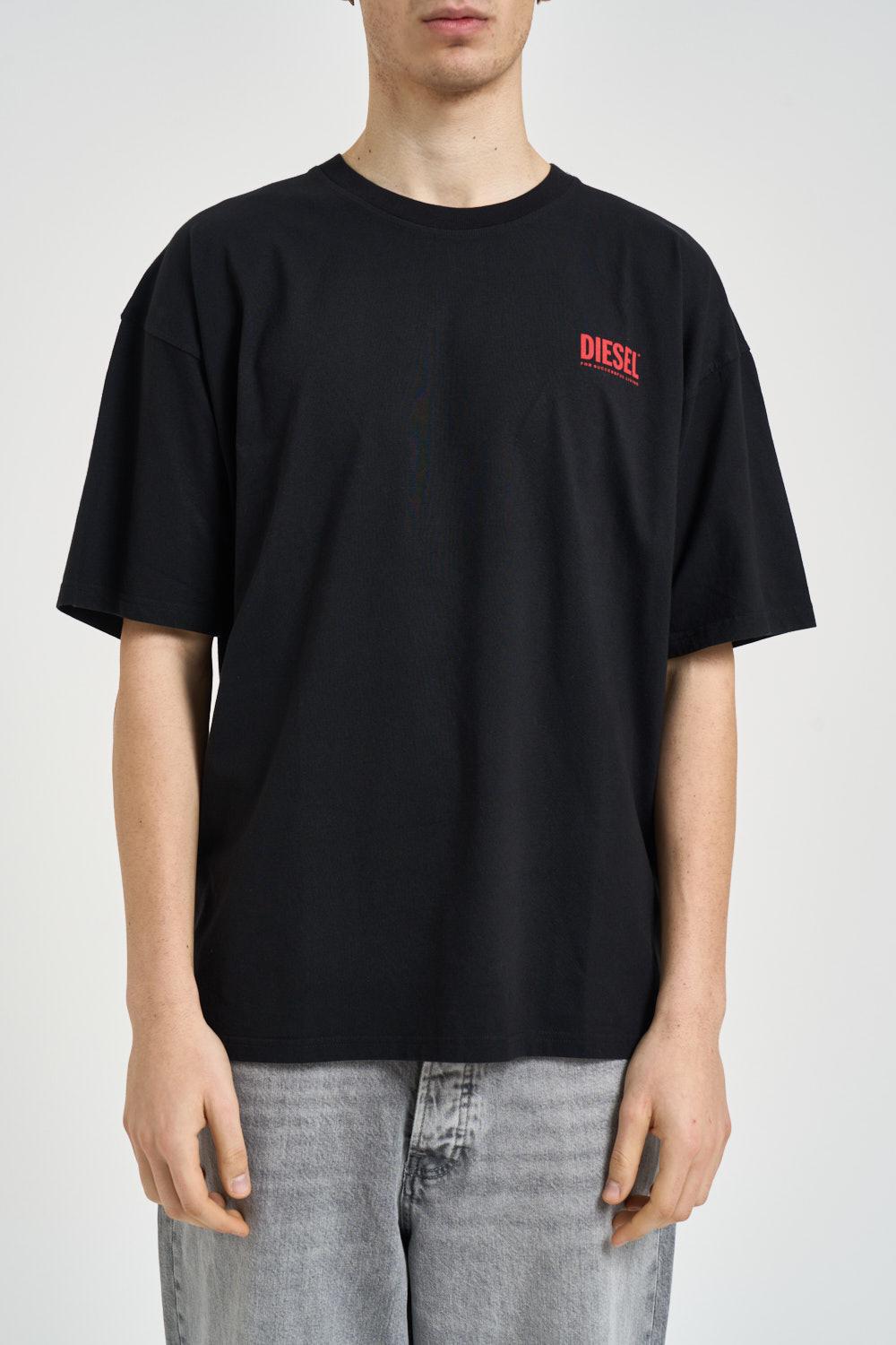 DIESEL T-shirt uomo girocollo nera. Modello dalla vestibilità rilassata. Stampa a contrasto sul petto. Stampa a contrasto sul retro. Manica corta. Spalla scesa. Composizione: 100% cotone. Il modello è alto 190cm e indossa la taglia L.