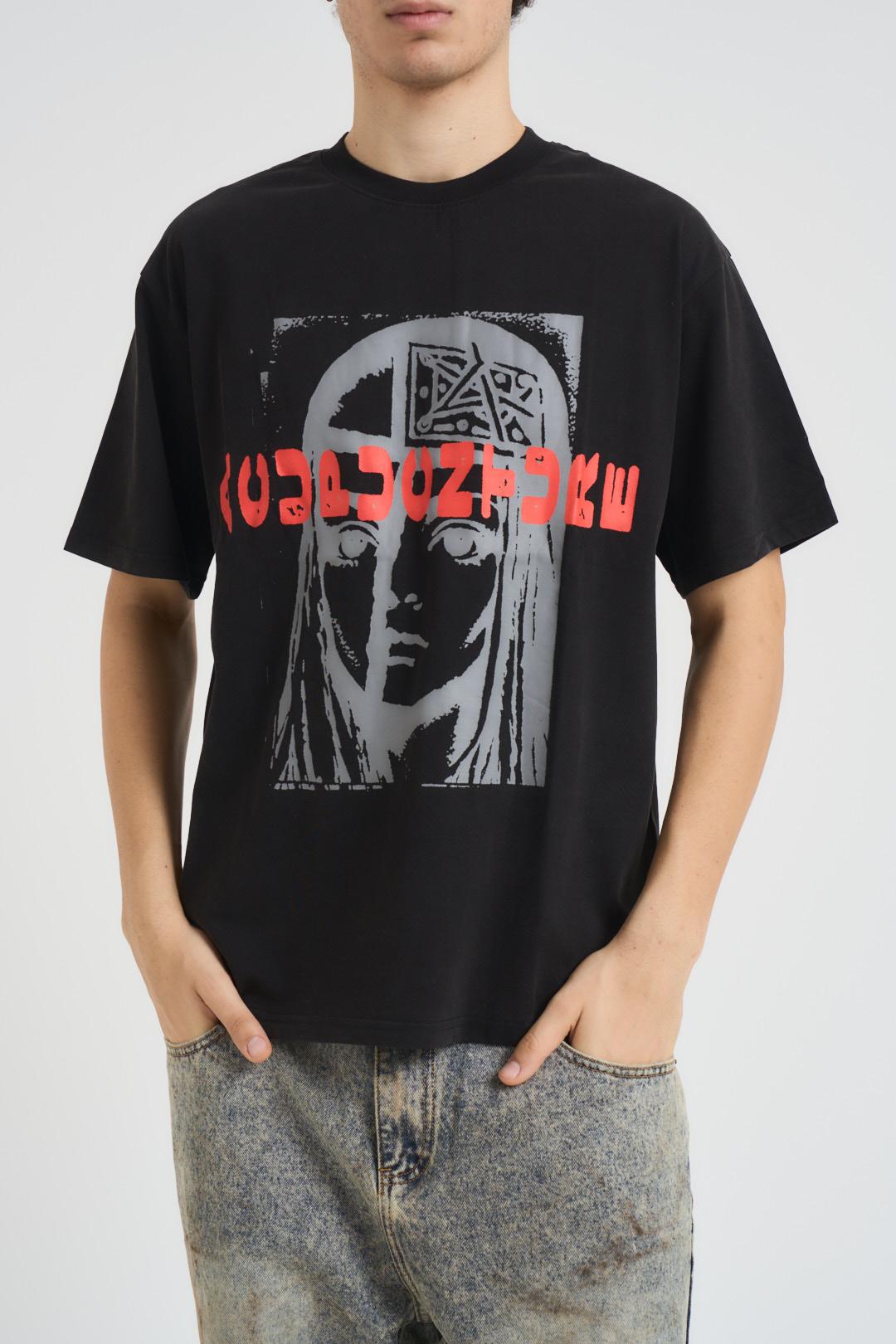 ACUPUNCTURE T-shirt uomo girocollo nera con stampa. Modello a manica corta, con stampa frontale e sul retro. Composizione: 100% cotone. Il modello è alto 190 cm e indossa la taglia L.