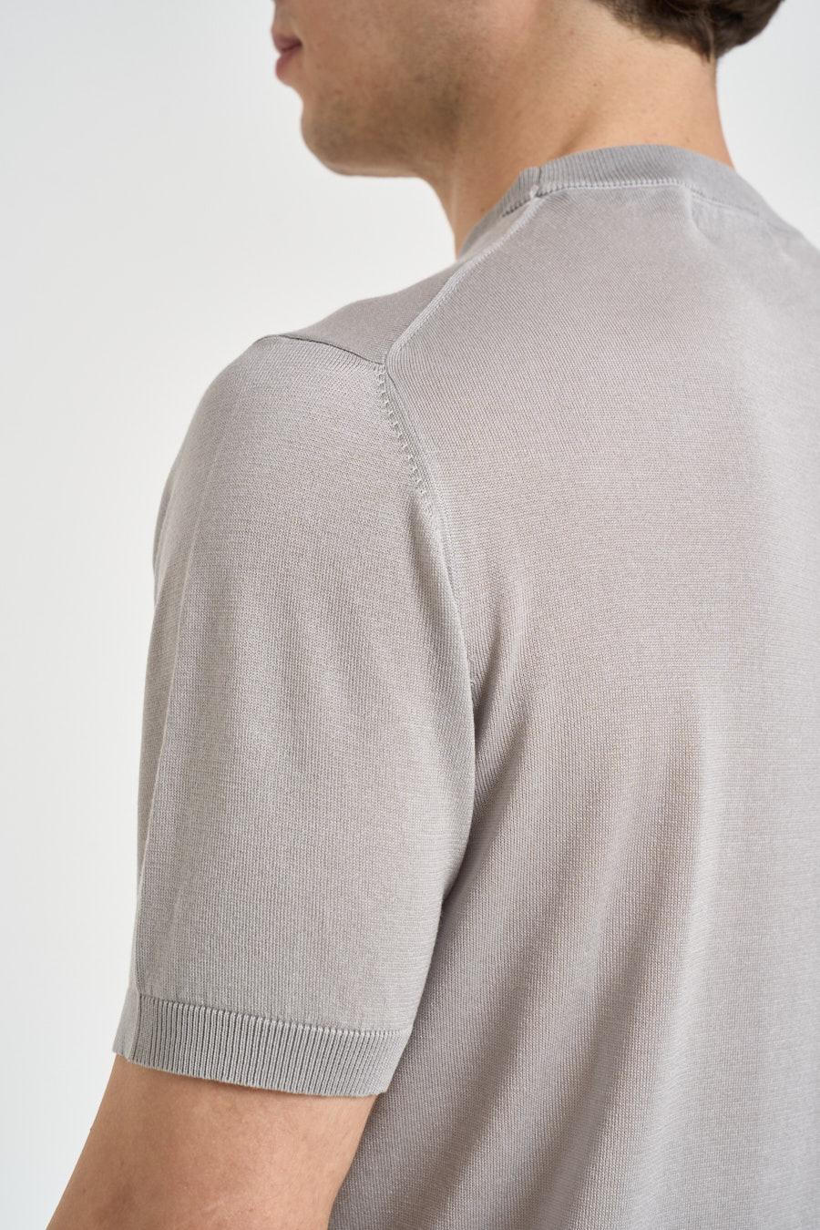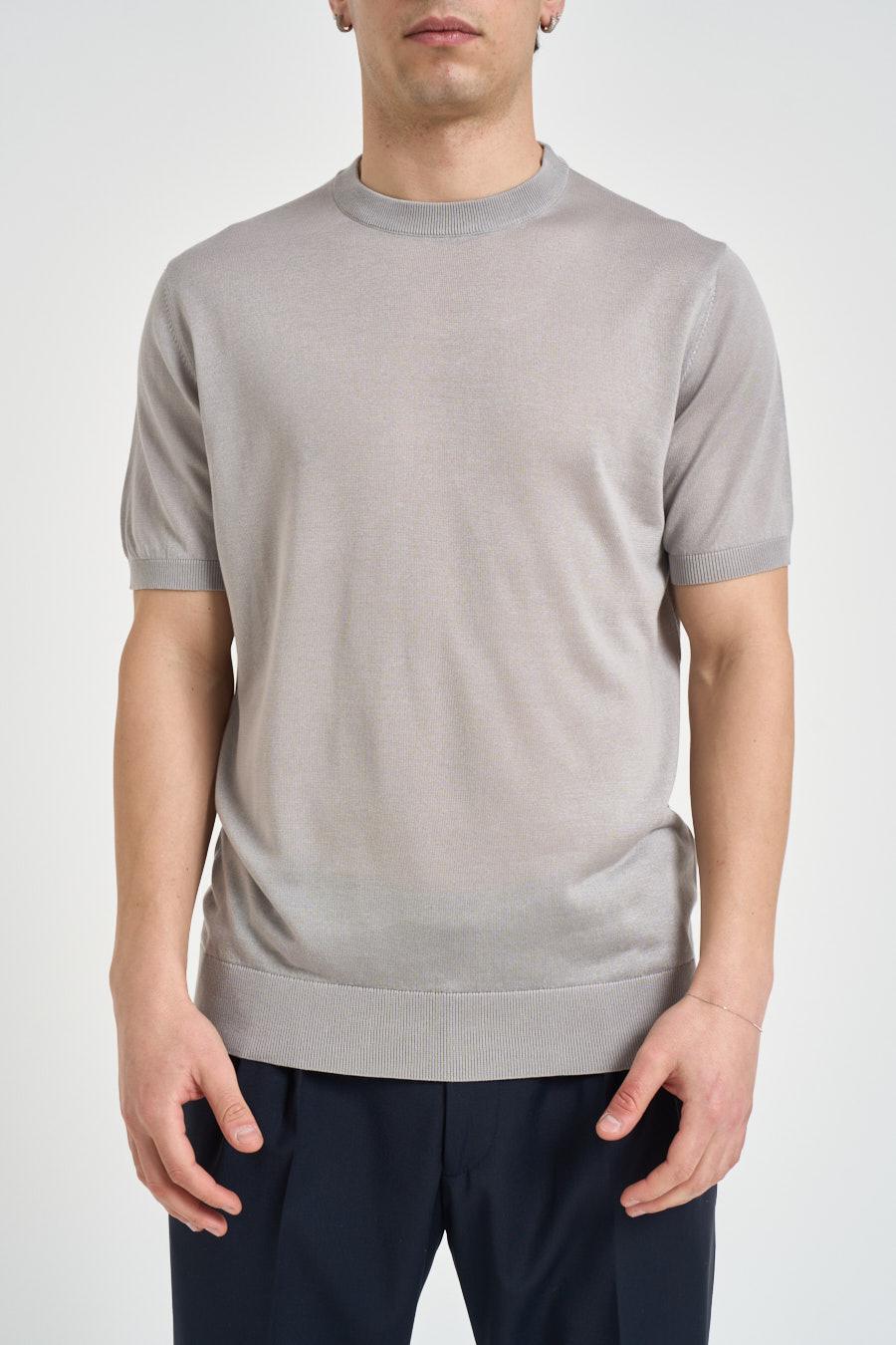 OUTFIT T-shirt uomo in maglia perla. Modello regular fit. Girocollo. Manica corta. Dettagli a costine. Composizione. 70% tencel, 15% seta, 15% cotone. Il modello è alto 190 cm e indossa la taglia L.