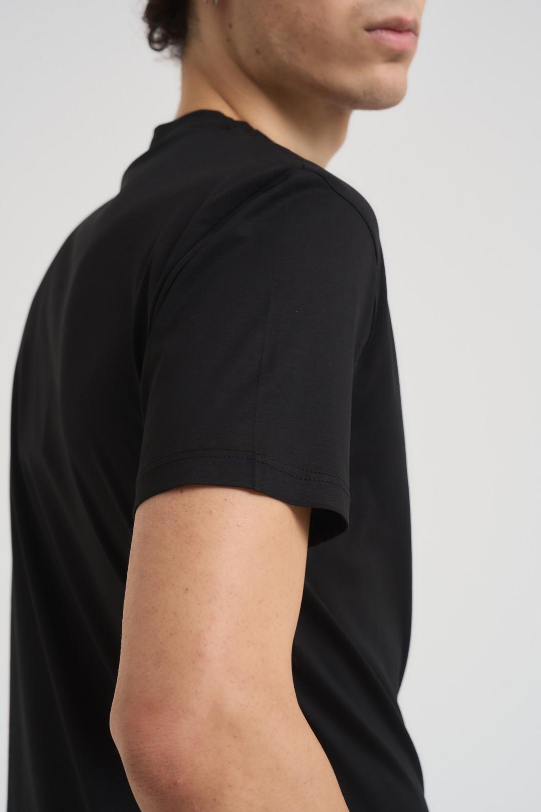 ACCADEMIE TESSILI T-shirt uomo nera. Modello girocollo a maniche corte. Composizione 100% cotone. Il modello è alto 190cm e indossa la taglia L.