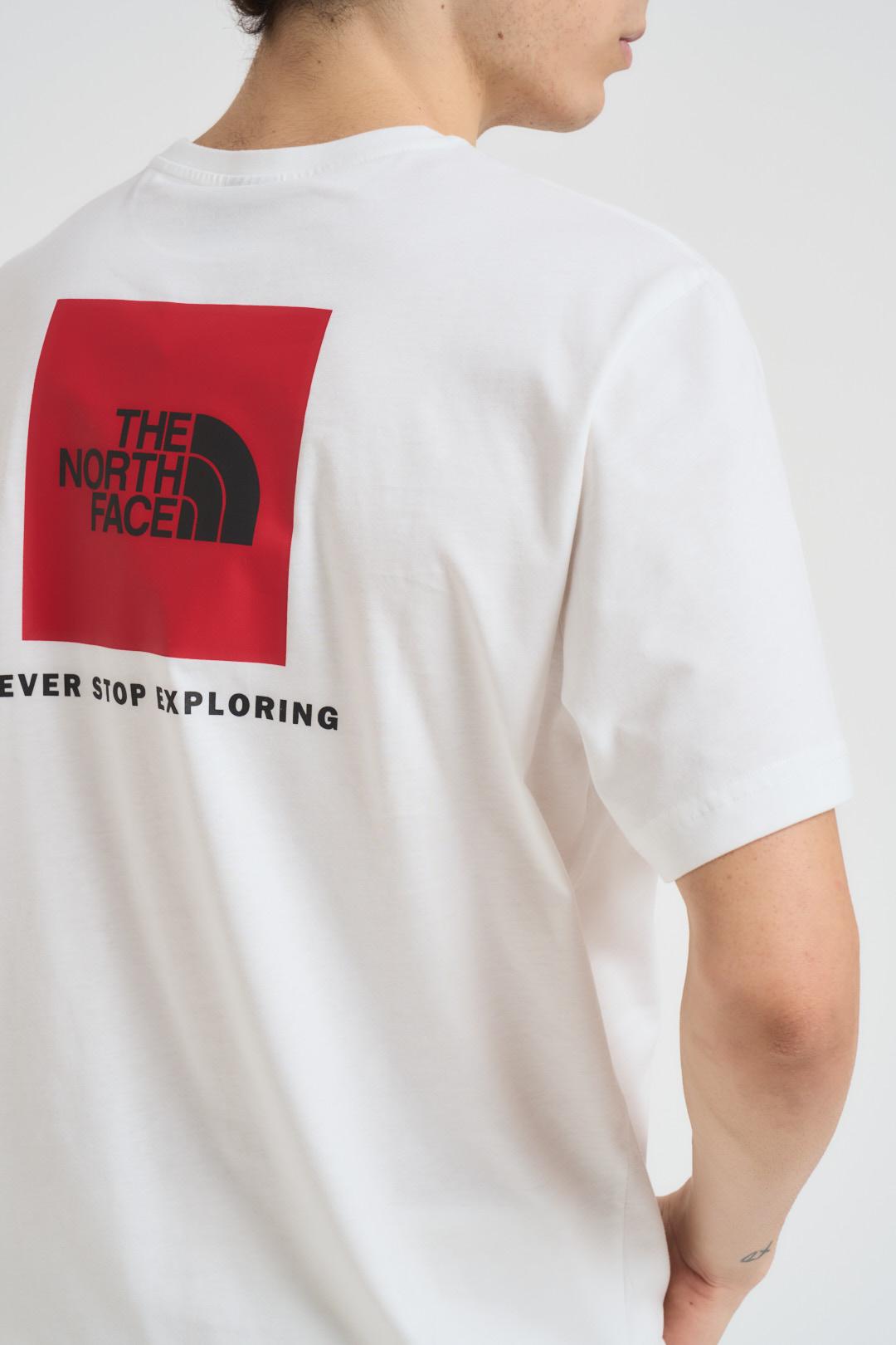 THE NORTH FACE T-shirt uomo Redbox bianca. Modello girocollo. Fit regular, lunghezza standard. Composizione: 100% Cotone. Il modello è alto 190 cm e indossa la taglia L.