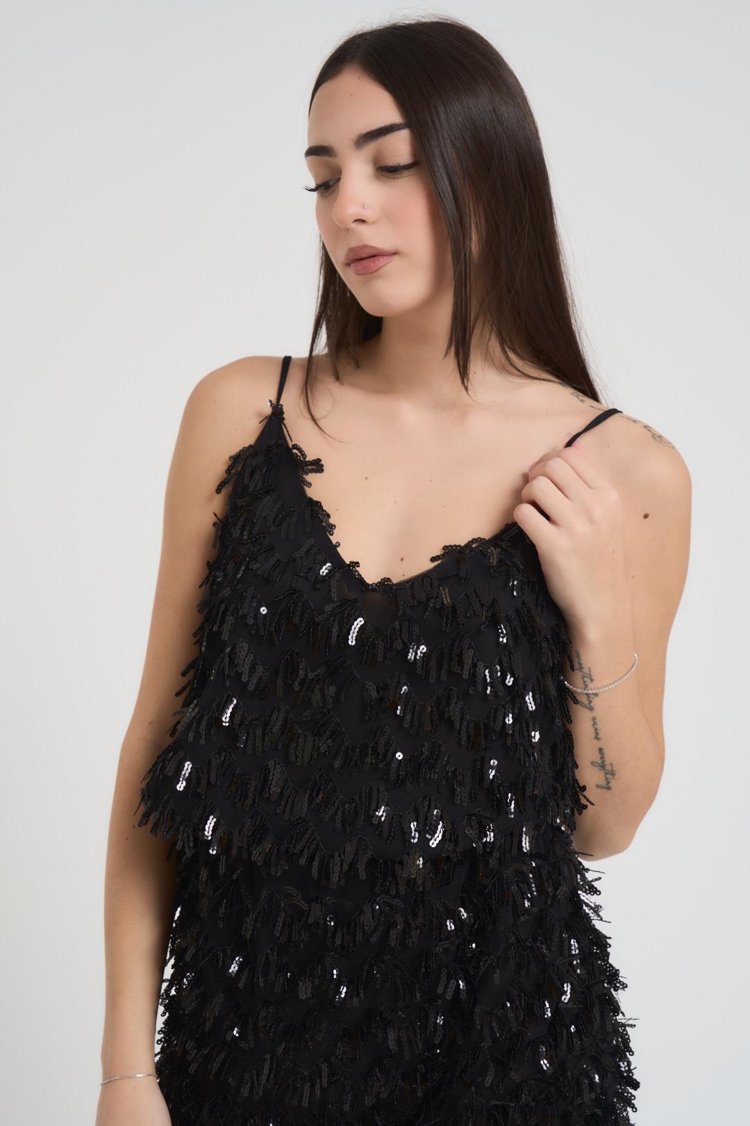 VICOLO Top donna paillettes nero. Modello regular fit. Scollo a V e spalline fine. Composizione: poliestere. La modella è alta 172 cm e indossa la taglia S.