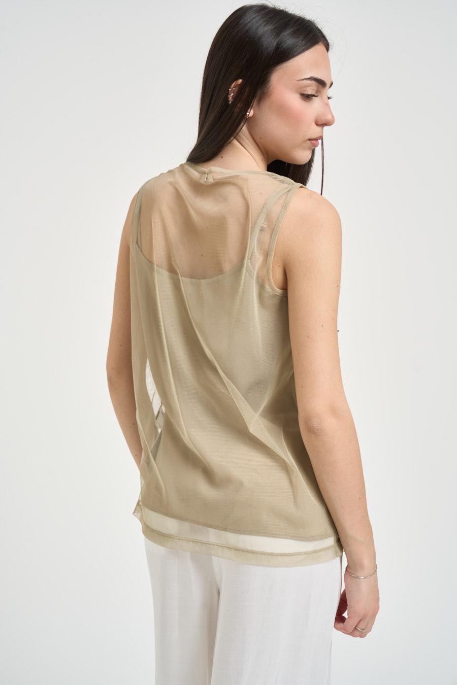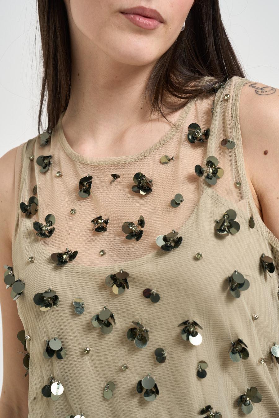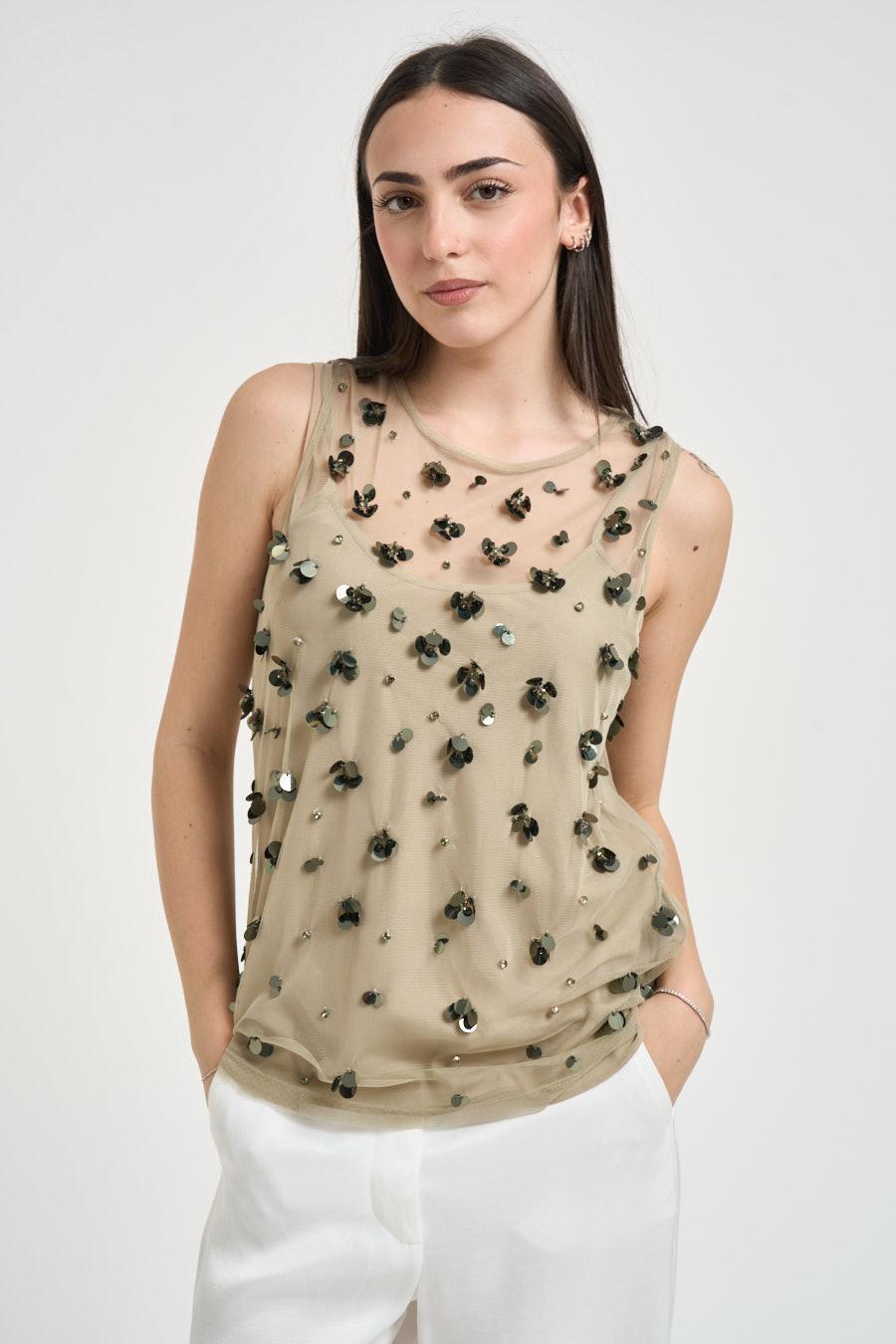 LIU JO Top donna applicazione con paillettes salvia. Modello regular fit. Smanicato. Scollo rotondo. Semitrasparente. Applicazione di paillettes tridimensionali e piccoli punti luce distribuiti su tutta la superficie. Composizione: 95% poliestere, 5% elastane. La modella è alta 172 cm e indossa la taglia S.