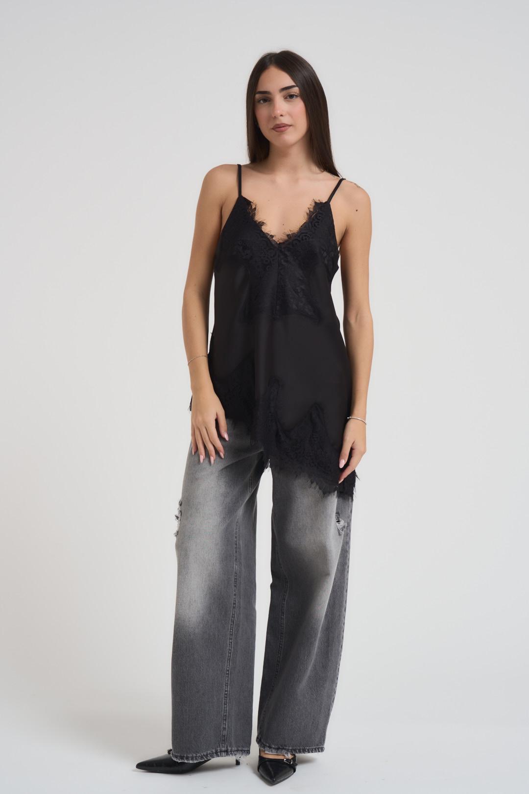 TENSIONE IN Top donna asimmetrico satinato in pizzo nero. Modello con un lato più lungo e uno più corto, dettagli in pizzo nero, spalline fini. Composizione: 100% poliestere. La modella è alta 172 cm e indossa la taglia S.