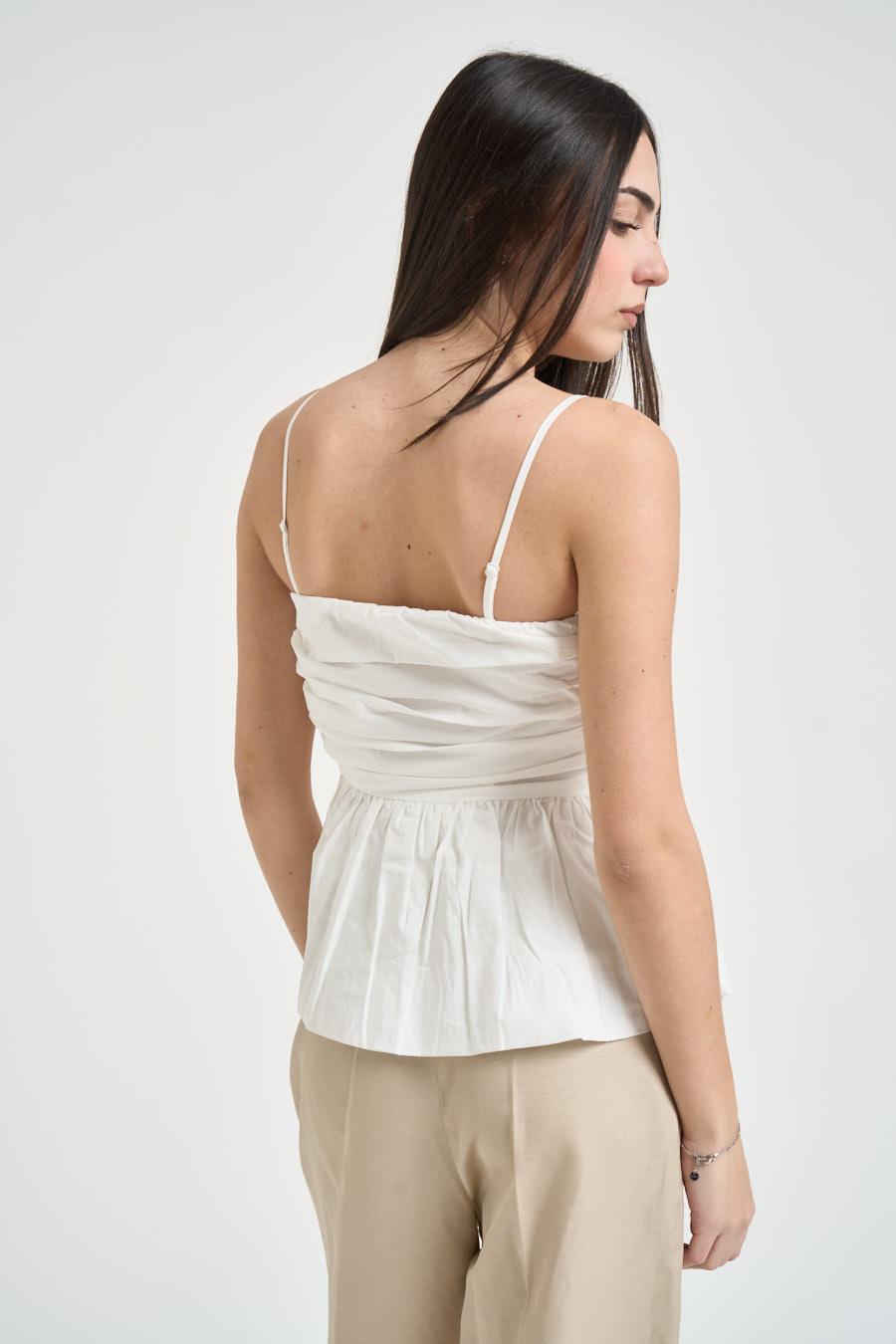 GRACE AND MILA Top donna con spalline bianco. Modello con sottili spalline e scollo dritto e lavorazione arricciata sul busto che crea un delicato effetto drappeggiato. Vita leggermente alta per valorizzare la silhouette, mentre il fondo con balza dona movimento. Composizione: 100% cotone. La modella è alta 172 cm e indossa la taglia S.