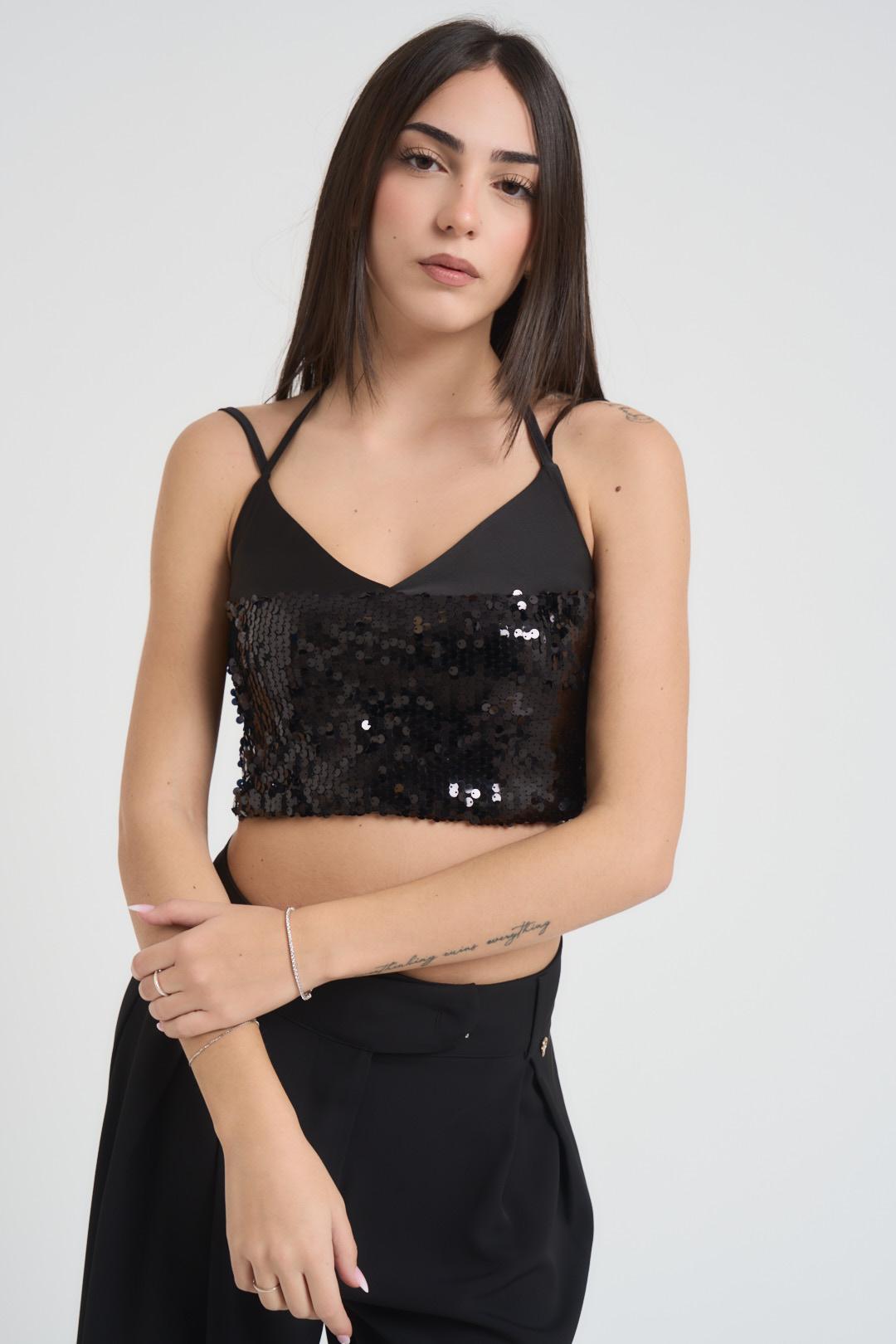 LOKITA MILANO Top donna cropped con paillettes nero. Modello con spalline fini, scollo a cuore e incrocio sul collo. Composizione: 100% poliestere. La modella è alta 172cm e indossa la taglia S.