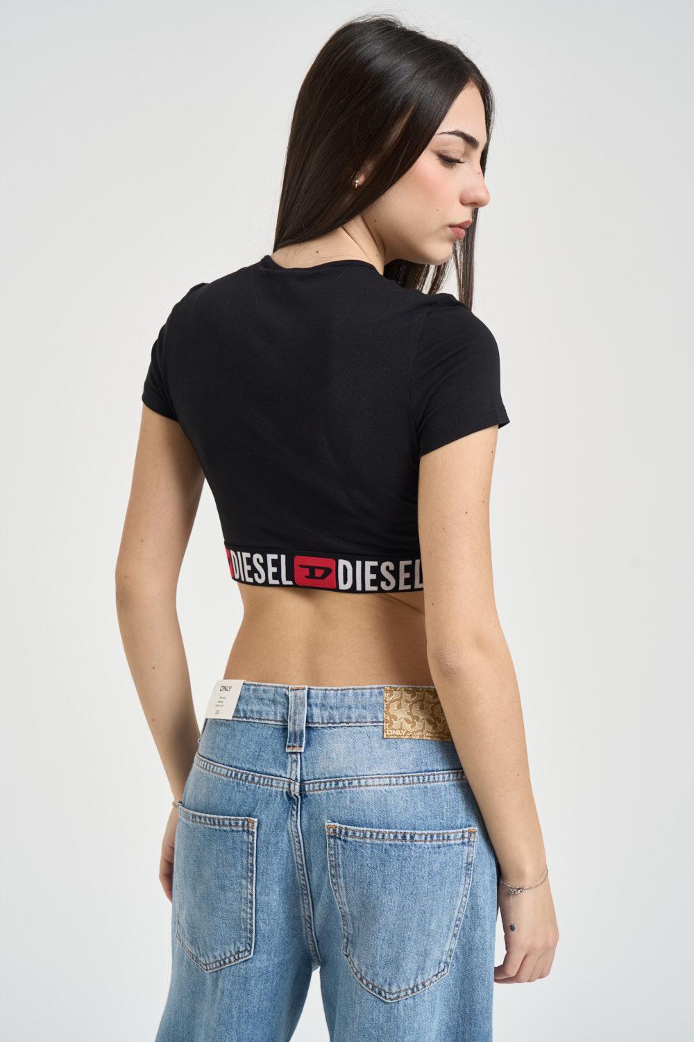 DIESEL Top donna cropped Irma-d-core nero. Modello aderente a manica corta con fascia inferiore elasticizzata in jacquard con il logo Denim Division. Composizione: 95%Cotton 5%Elastane. La modella è alta 172cm e indossa la taglia S.
