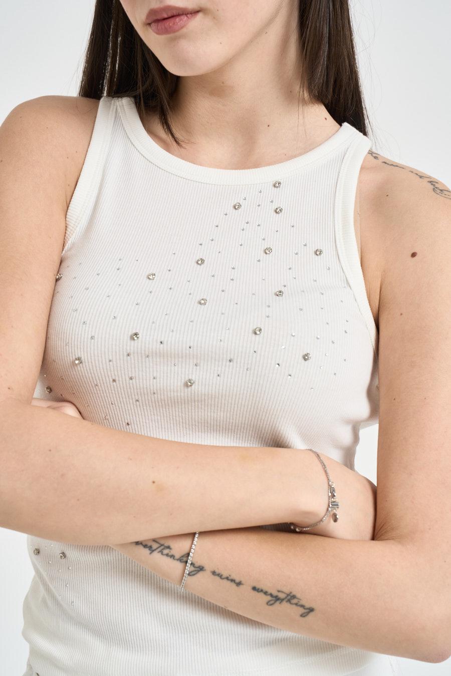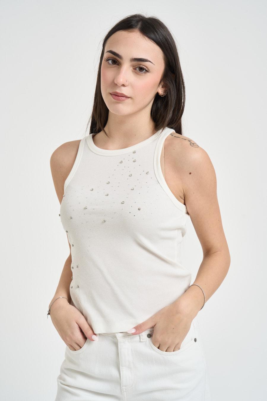ONLY Top donna girocollo bianco con strass. Modello senza maniche, regular fit. Composizione: 95% Cotone 5% Elastane. La modella è alta 172cm e indossa la taglia S.